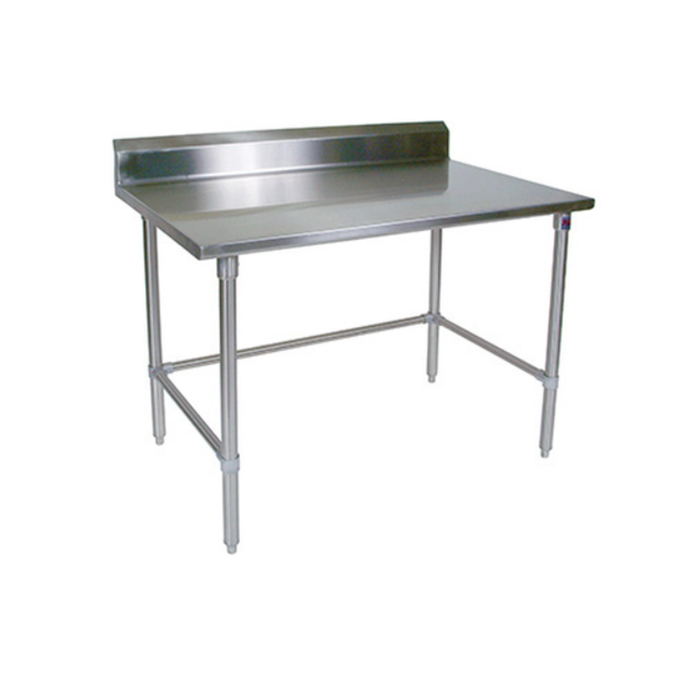 Stainless steel table with 15/8" rolled rim on the front and rear with square end. The legs are fully adjustable with 15/8" diameter and adjustable plastic unit. SST 306 NS model dimension is 72" L x 30" W x 35 1/2" H and 101 lbs. weight. This model has 5" backsplash and no undershelf included.
