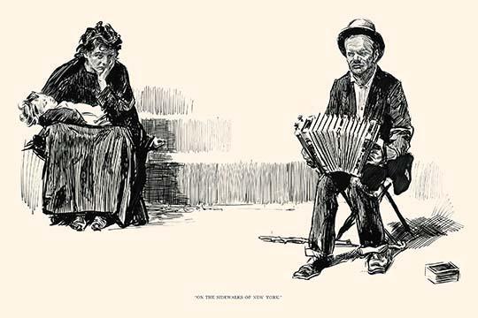 12inch x 18inch Poster A poor immigrant family on the sidewalk of New York with a man playing an accordion and the woman with a baby in her lap. - There is a border around the image. Image size is correct.