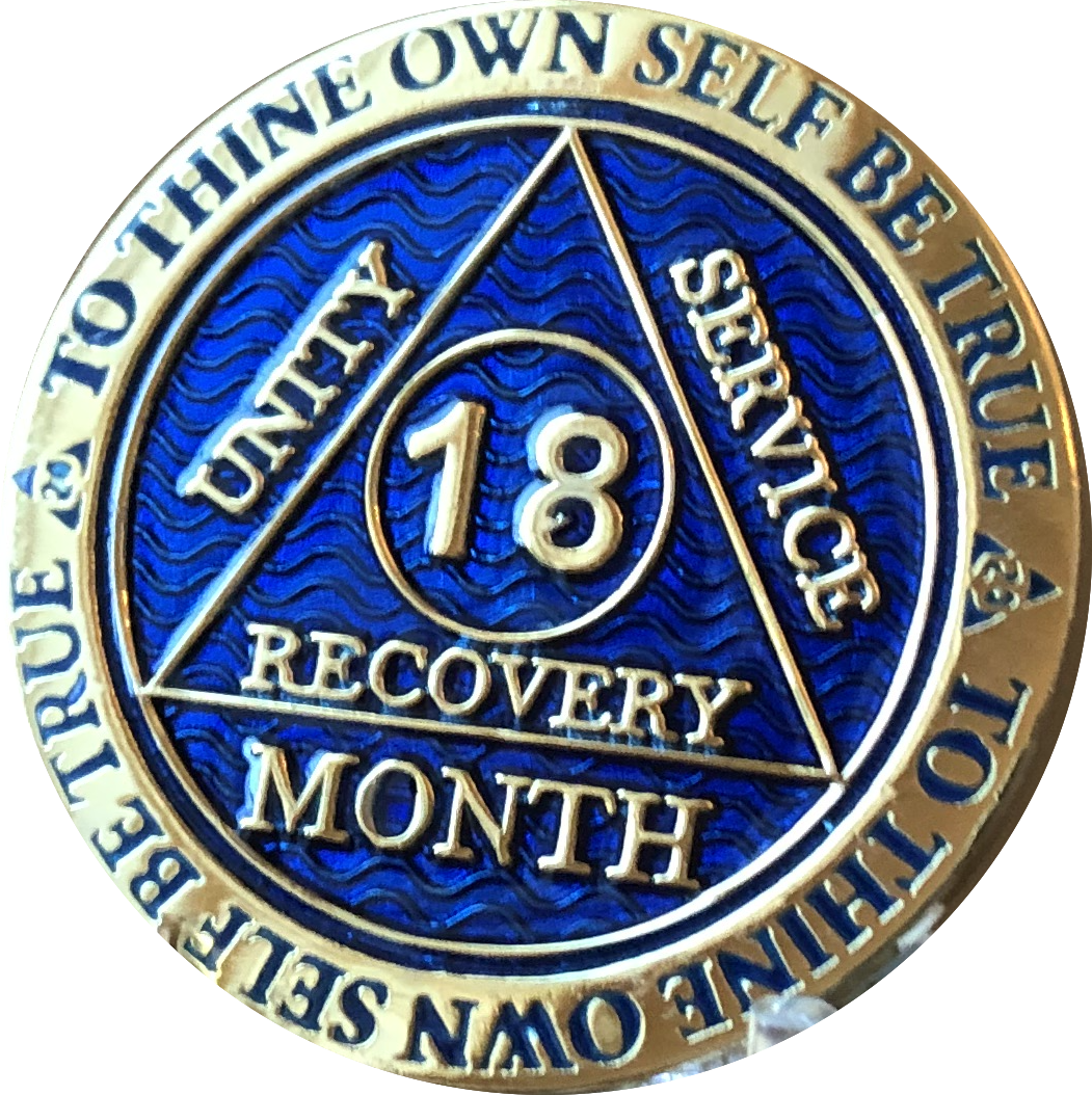 18 Month Alcoholics Anonymous Sobriety Medallion In Reflex Blue Color and Gold Plated