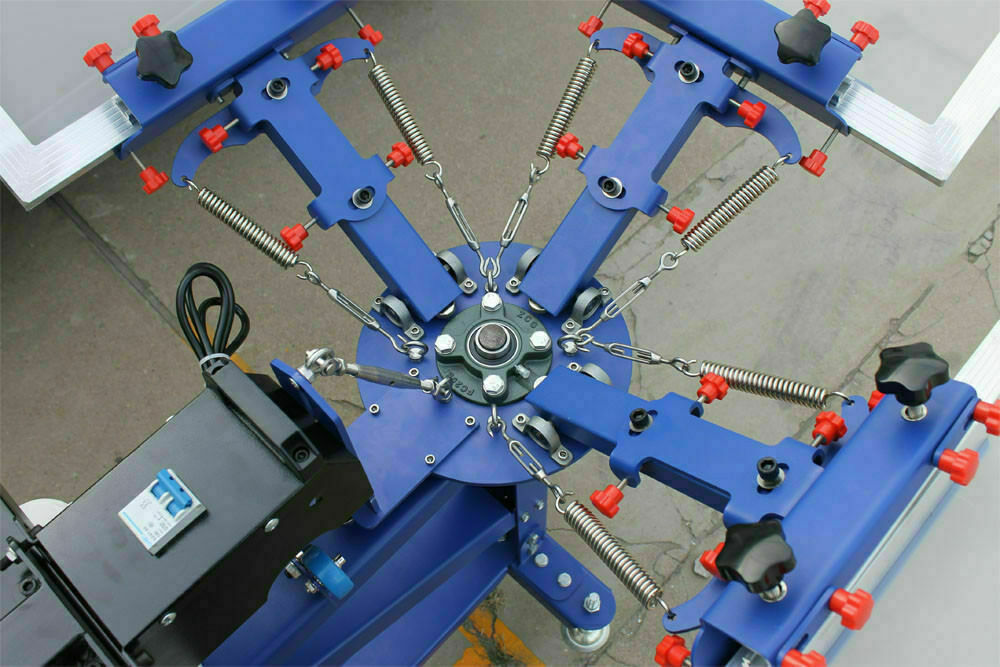 This new type machine has a function of micro-adjust. The metal stand could make sure the printer is stable when you doing press work. If you want to do color matching, you can use those small red handles to move the screen frame right or left slightly. The clamps on the holder could also be adjust within 2cm.It will be a good choice for colorful printing.