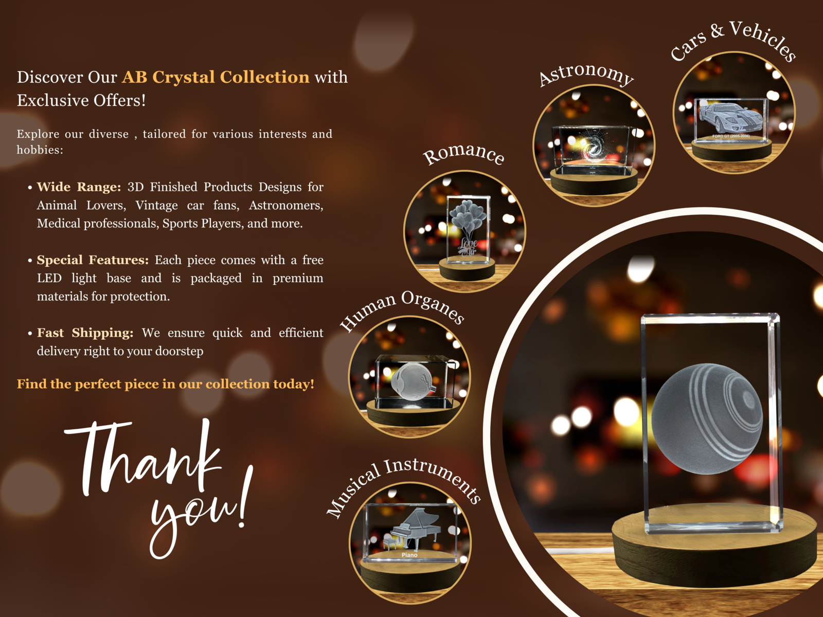 First, our designers create a unique and detailed 3D model. Then, our skilled technicians etch the 3D model into crystal using advanced laser technology.
