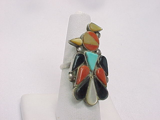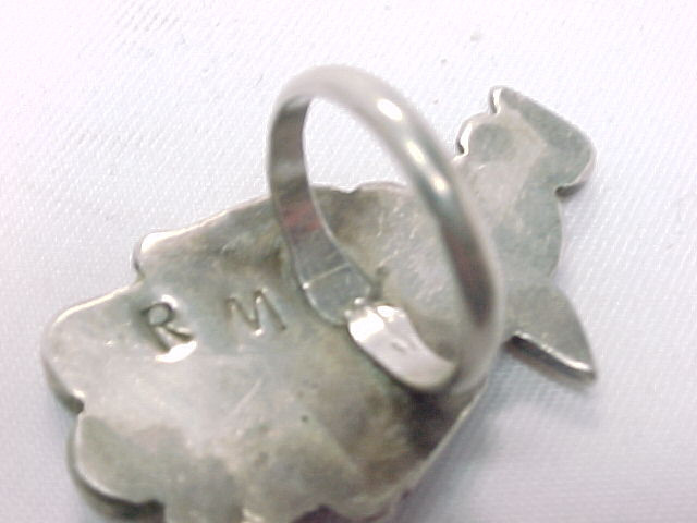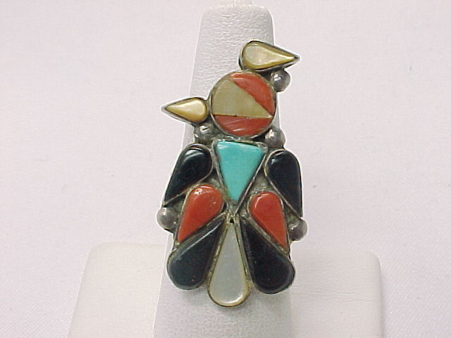 Vintage Navajo Silversmith signed, RM, STERLING SILVER Ring in a THUNDERBIRD design using Coral, Turquoise, Mother of Pearl, and Black Onyx. Size 6. Marked RM. Tested to confirm the Sterling content. Measures 1 1/2 inches long on the finger. HUGE! Weighs 8 grams. Huge Native American Ring!!! ..... Also enjoy FREE SHIPPING with delivery confirmation (tracking number) and FREE INSURANCE. ..... Please contact seller before ordering from Canada.