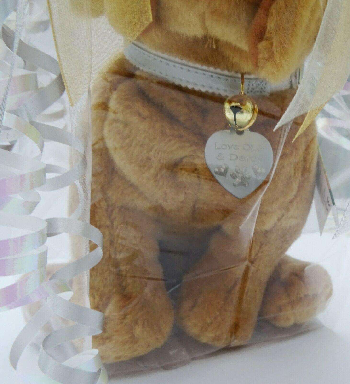 fitted with a collar with a personalised engraved tag of your choice attached, we can engrave them with a name or message on one or both sides.