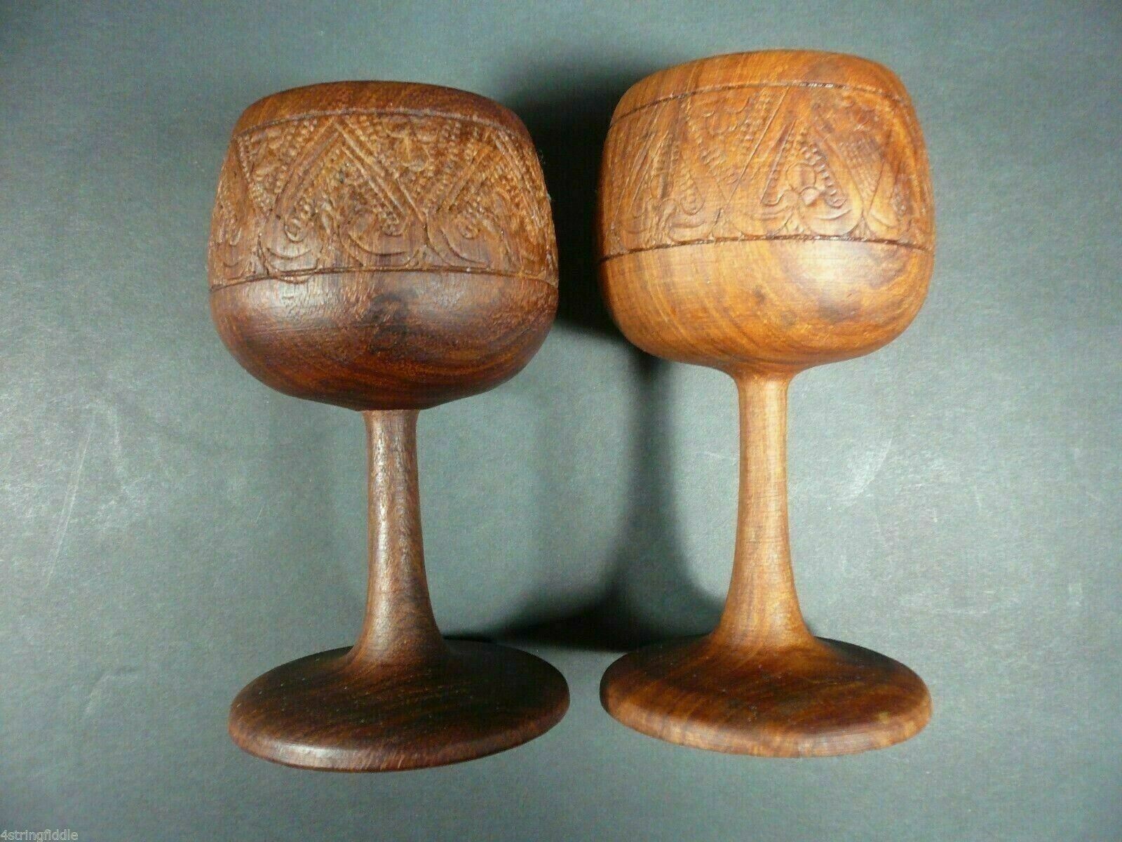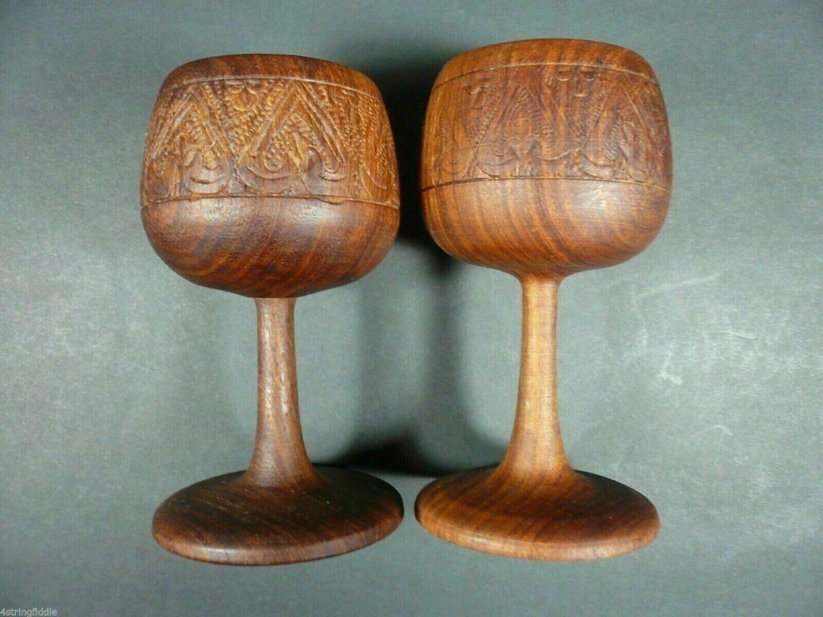 Set of 2 Vintage Mid Century Hand Carved Teakwood Wine Goblets