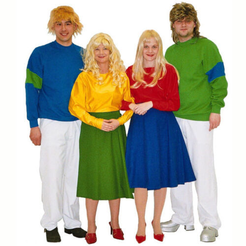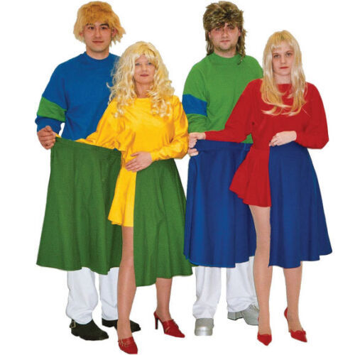 These costumes are good quality , made for use in hire shops / theatre and stage - the ladies outfit comprise lycra scooped neck dress , wrap around "whip off" overskirt , and wig . The mens comprise white trousers , bright jumper and wig