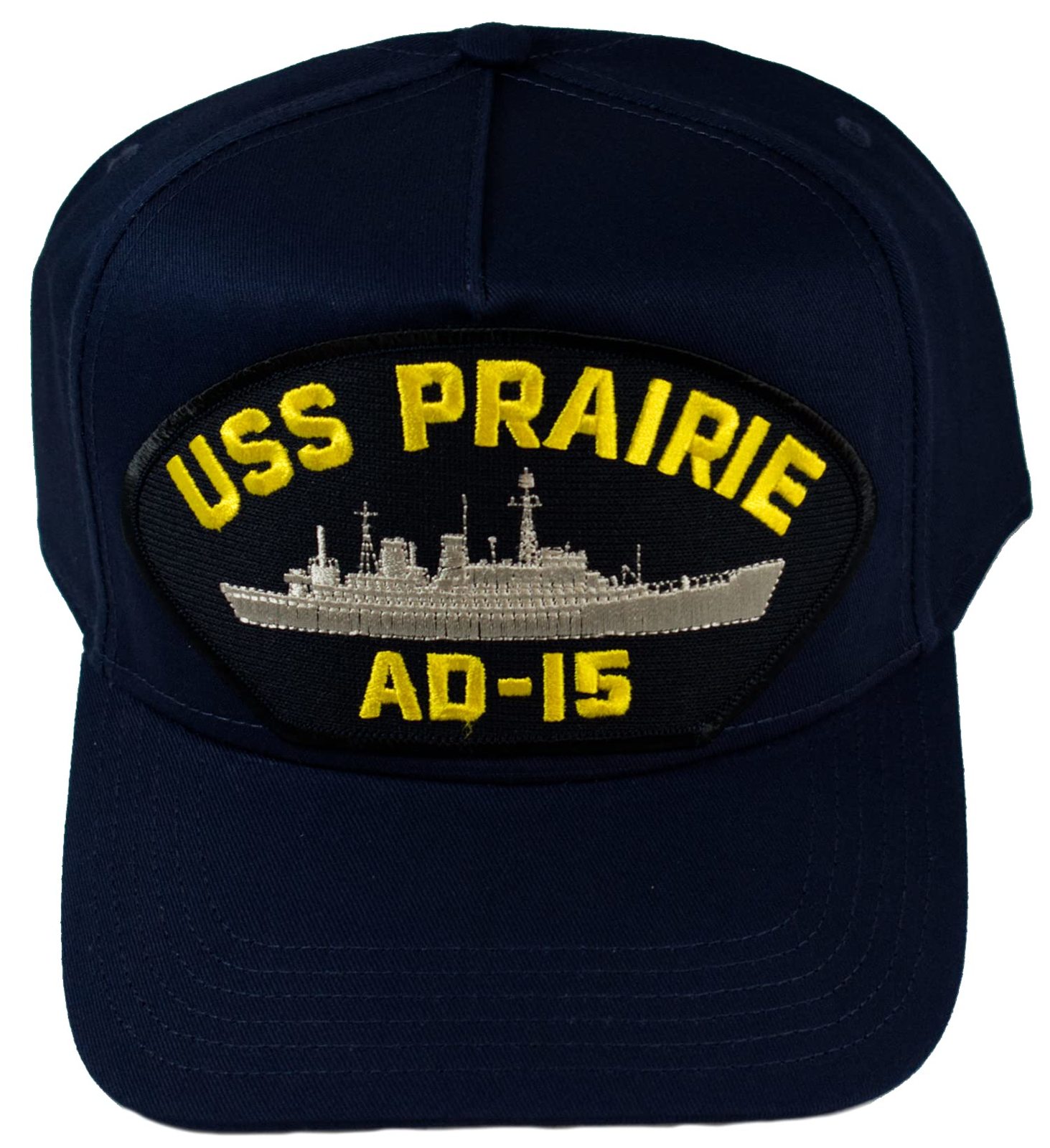 USS PRAIRIE AD-15 SHIP HAT - NAVY BLUE - Veteran Owned Business. Navy Blue Cap High Detail and Impact - USS PRAIRIE AD-15 SHIP HAT. 8 Rows Stitching on Visor and Pro Stitch on Crown 5 panel hat. USS PRAIRIE AD-15 SHIP HAT - Adjustable Size, Navy Blue Golf Style. HatnPatch Is THE Veteran Owned and Operated Family Business - 2 Generations of Retired Marines - We Ship Your Order Within 24 Hours And Usually The SAME DAY!