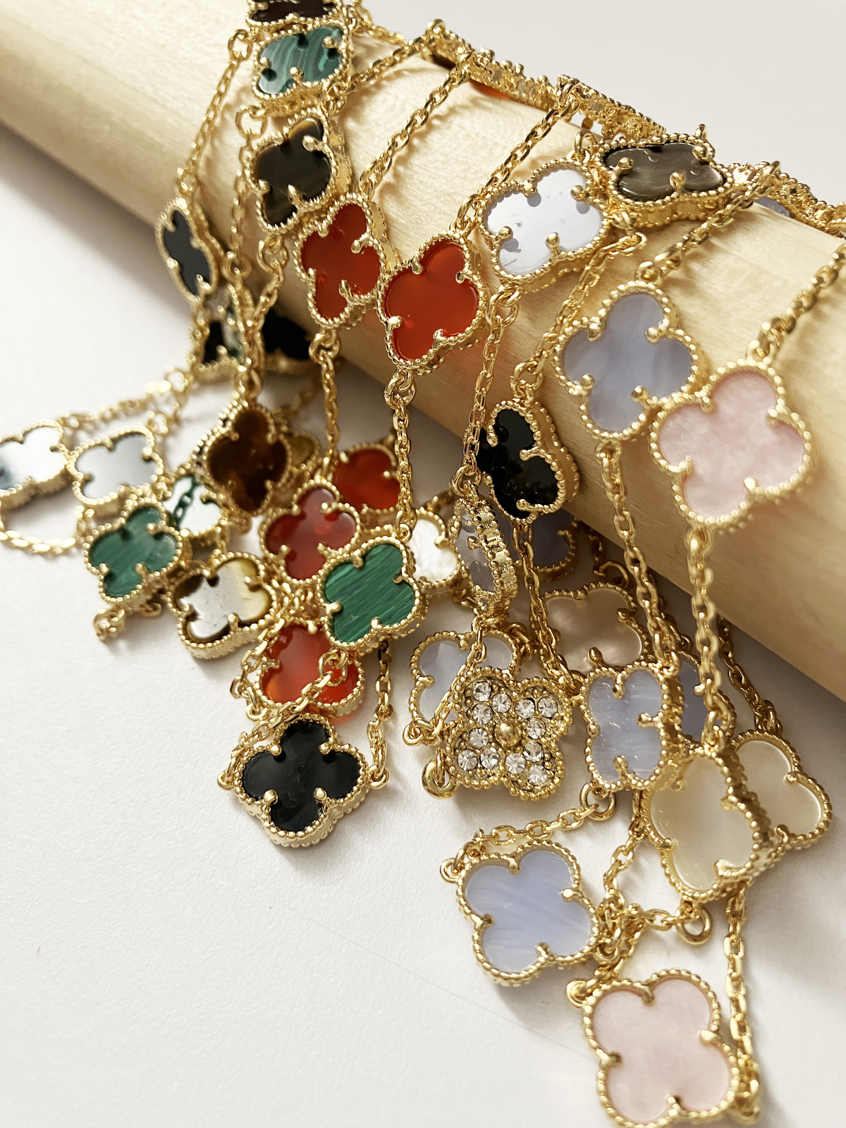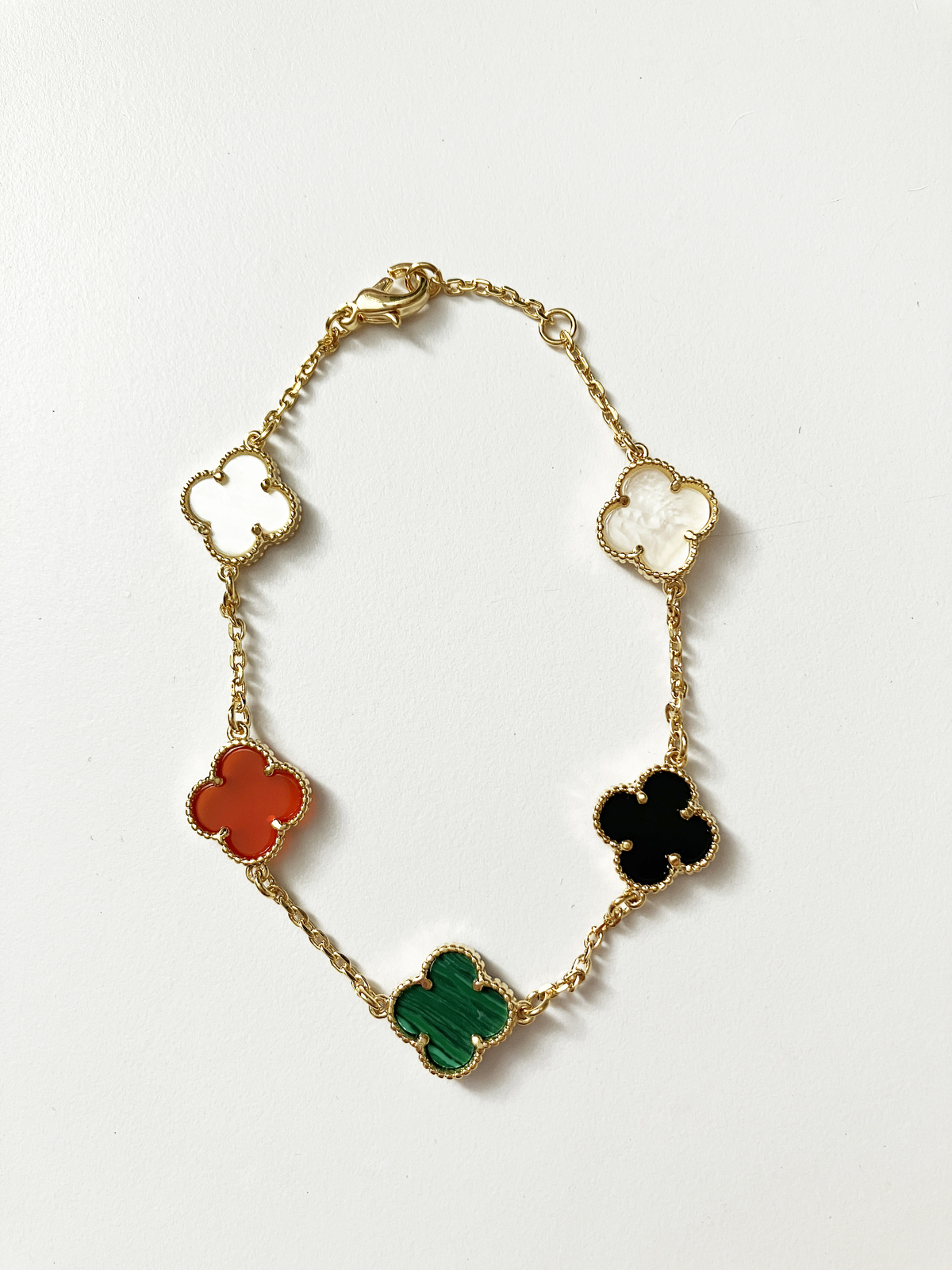 Adjustable 7.5" bracelet with 5 mini quatrefoil shaped onyx, carnelian, malachite, and mother of pearl stones set in gold plated non-tarnishing surgical steel.