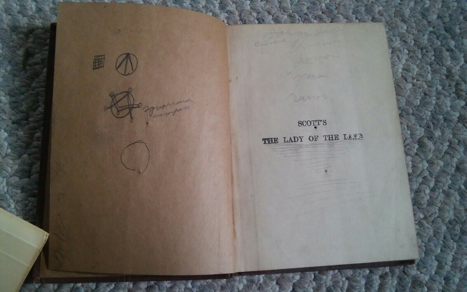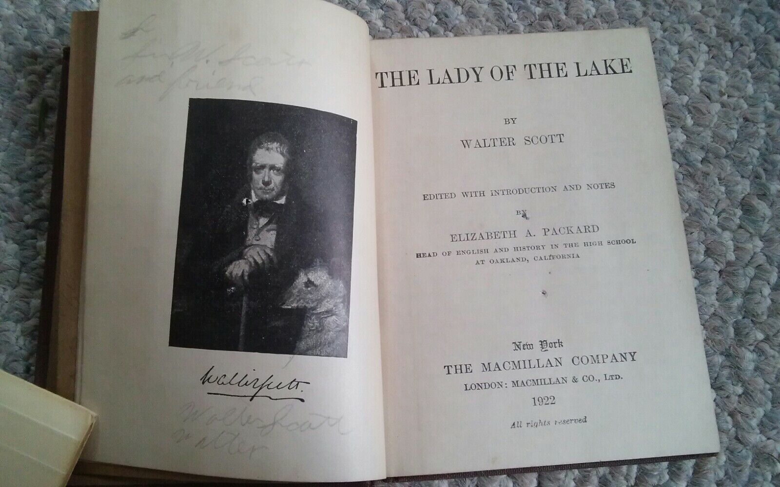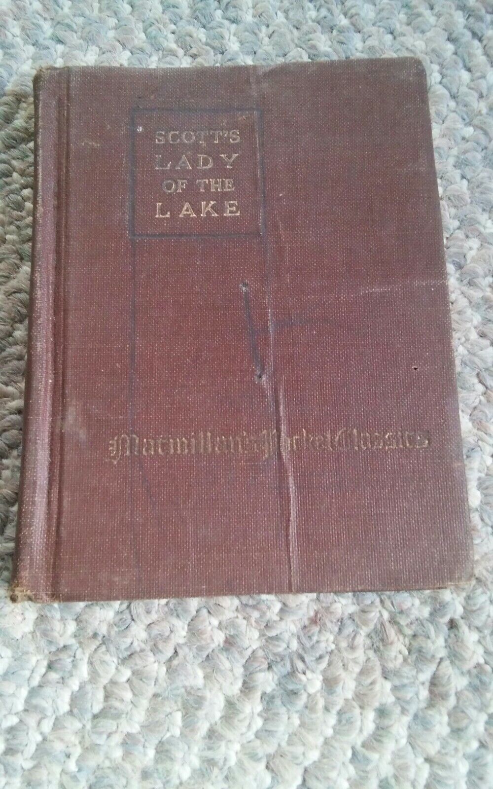 Here is a 1922 Walter Scott Lady Of the Lake book. Has writing inside the front pages. Has wear from use and age. Is a small book. Measures 5 3/4 x 4.5 approx.