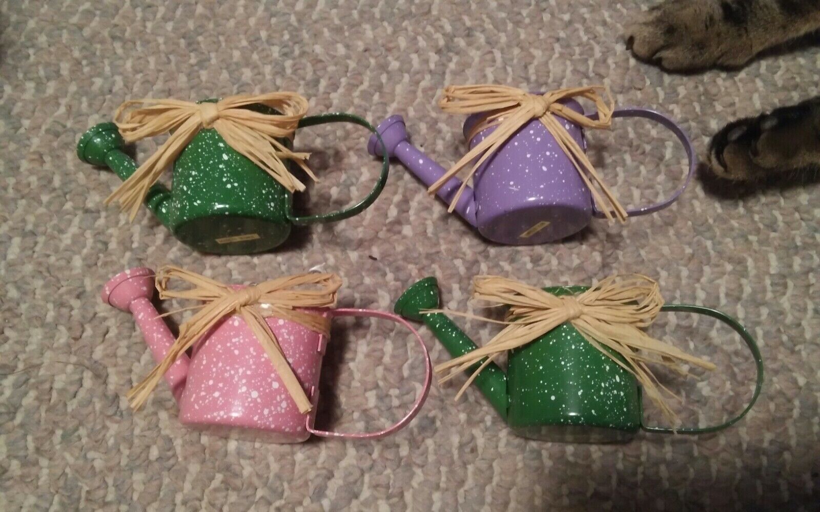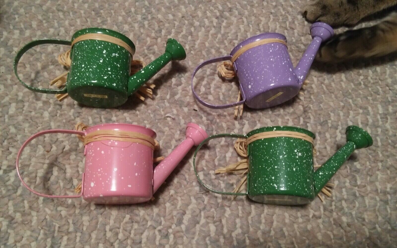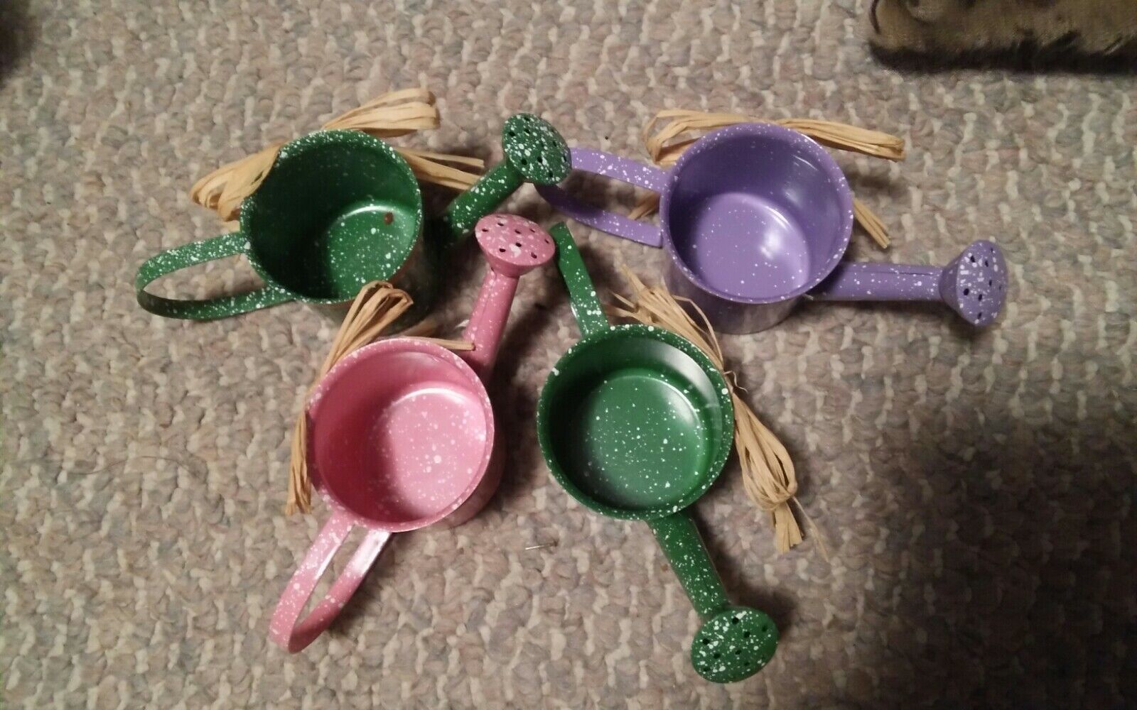 Lot of 4 NIP Mini Watering Sprinkling Cans Metal Small Display Speckle Colors