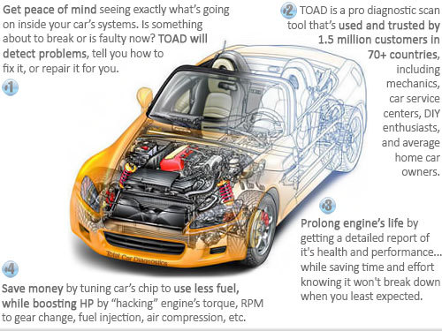 Because of limited description space - see here at official product site to learn more about what TOAD software/scanner can do for you, how it'll help and how your vehicle will benefit: