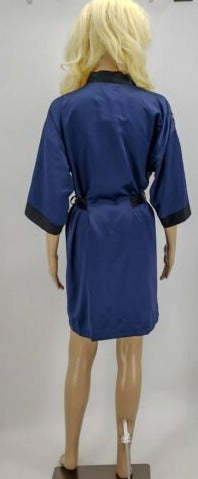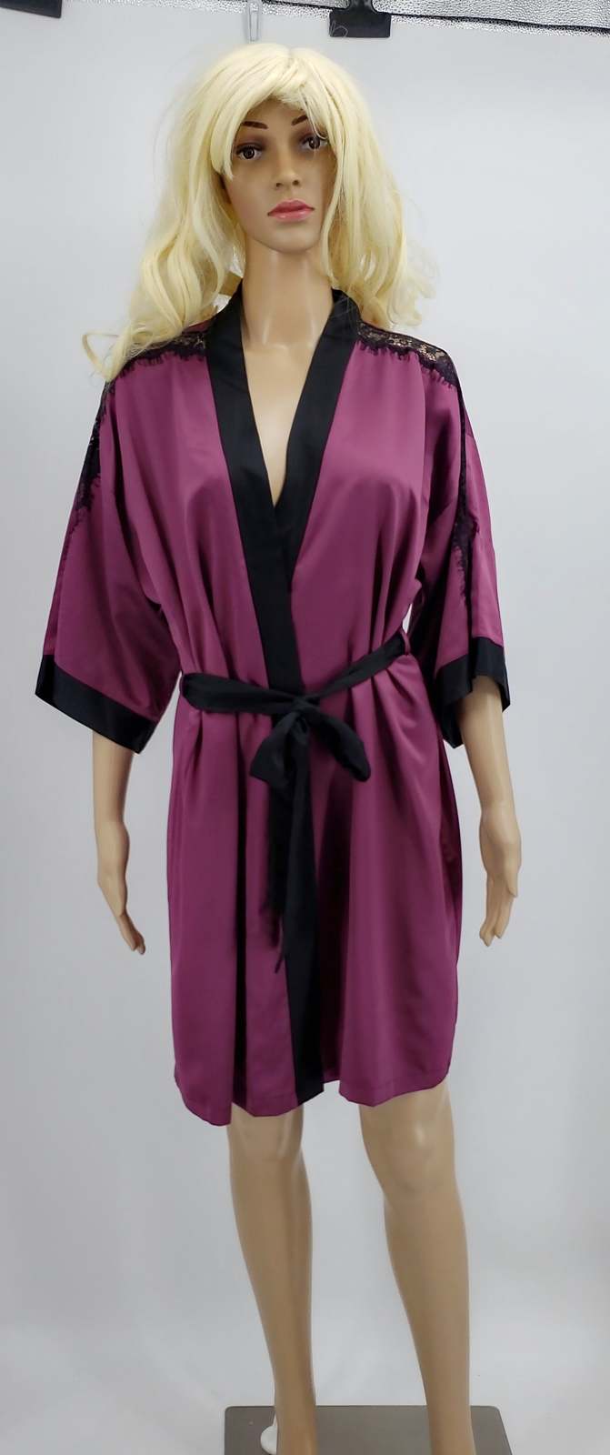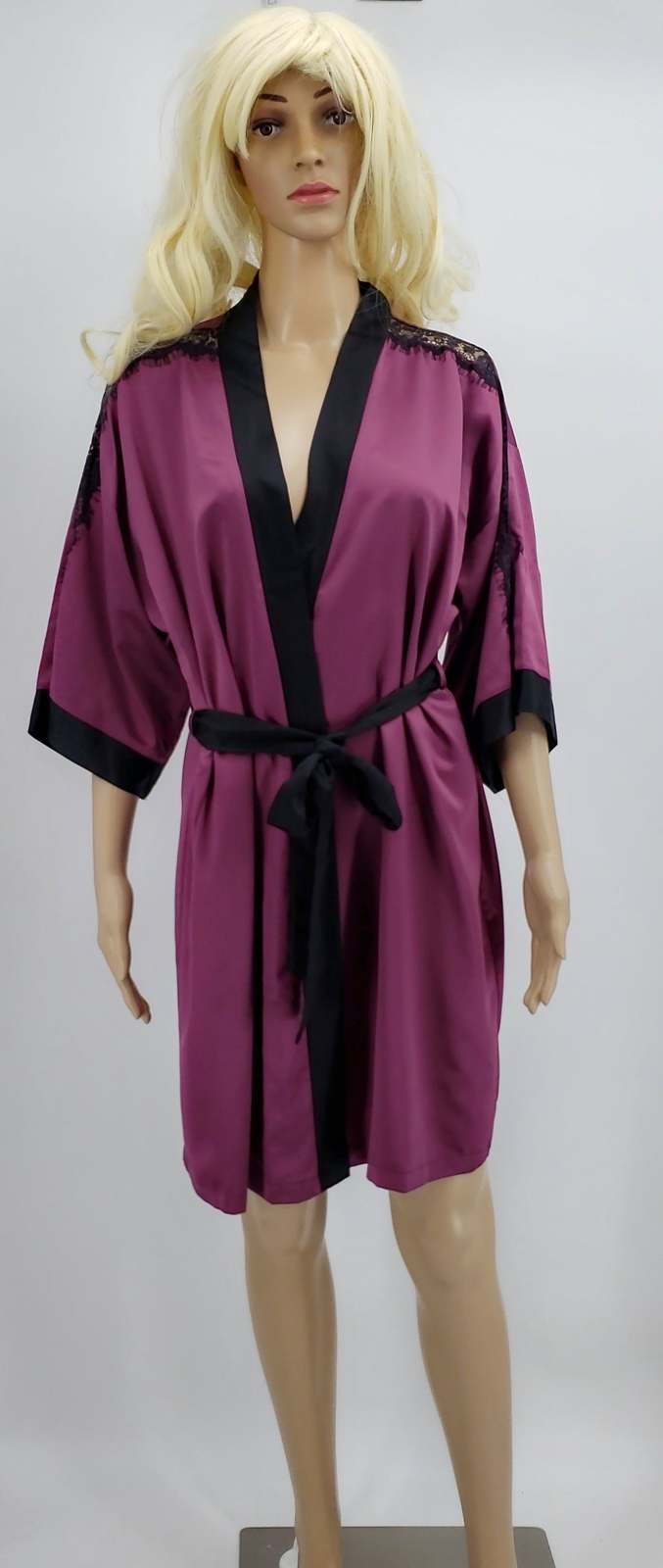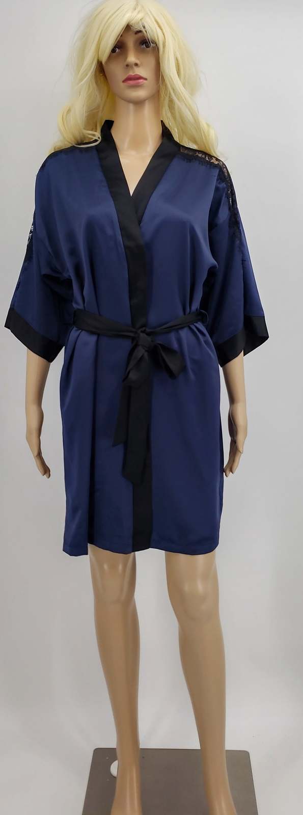 Wrap robe: Hits above knee: approx. 34 long, woven satin fabric, contrast band at front opening, attached contrasting outer belt, 3/4-sleeves with lace trim and contrast cuffs Polyester Machine washable Imported