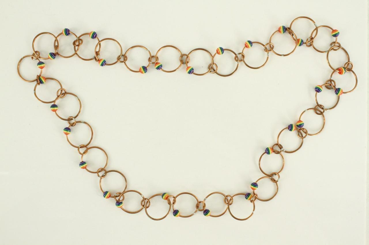 MODERN Artisan Jewelry COPPER Circle Links Rainbow Beads Necklace Bracelet. The necklace is 28" long. The matching bracelet is 8" with a heart dangle charm. No smoke or pet odor. You get the exact pieces you see in the photo. Please refer to photos in listing for further information on condition.
