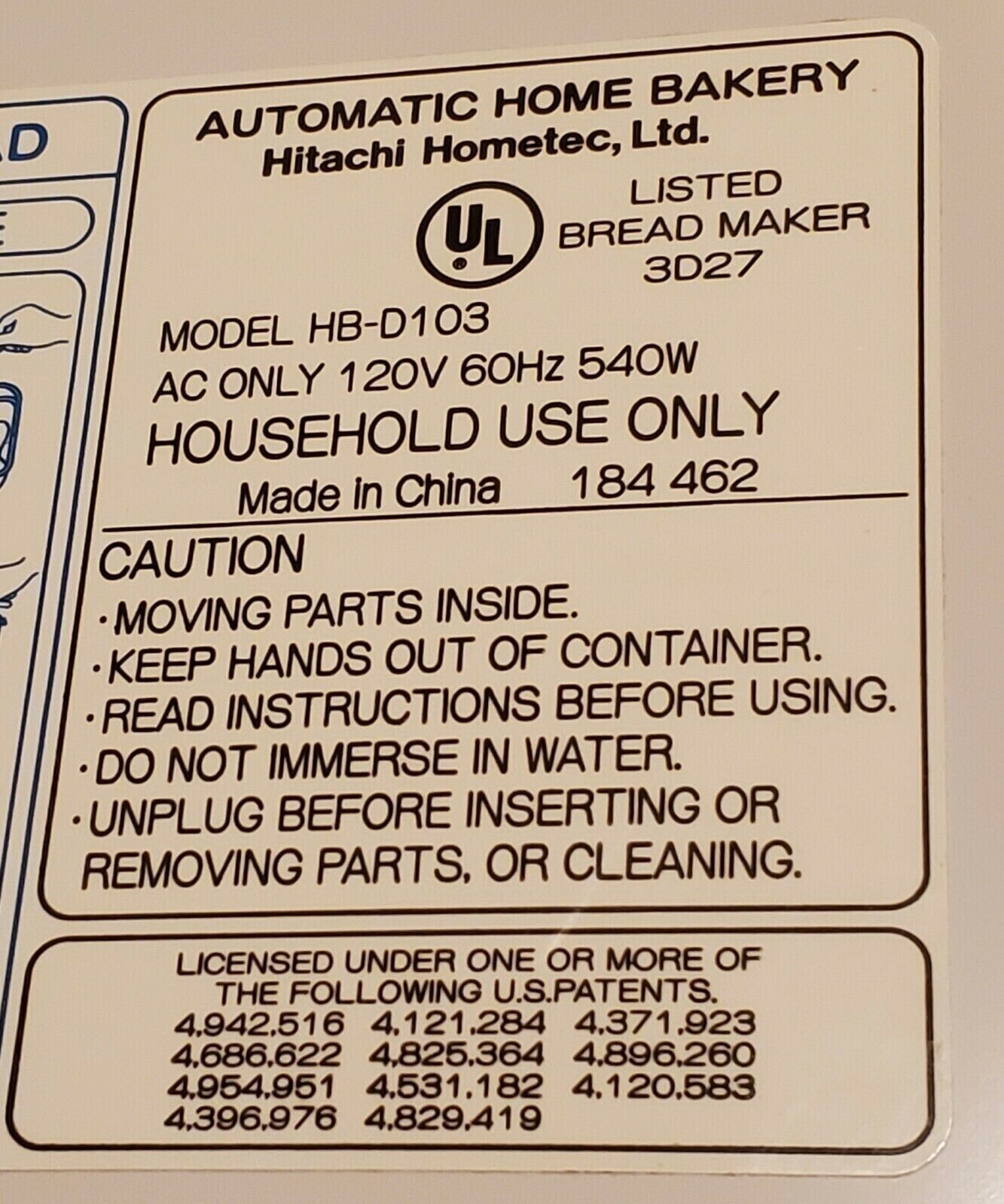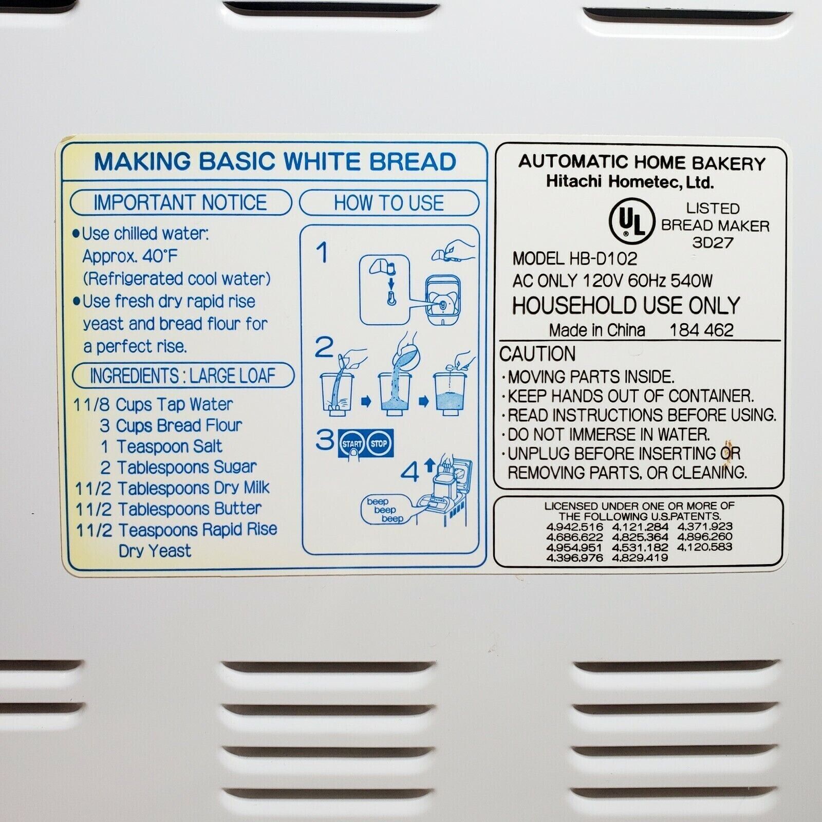 Hitachi Breadmaker Model HB-D102 HB-D103 HB-D301 |