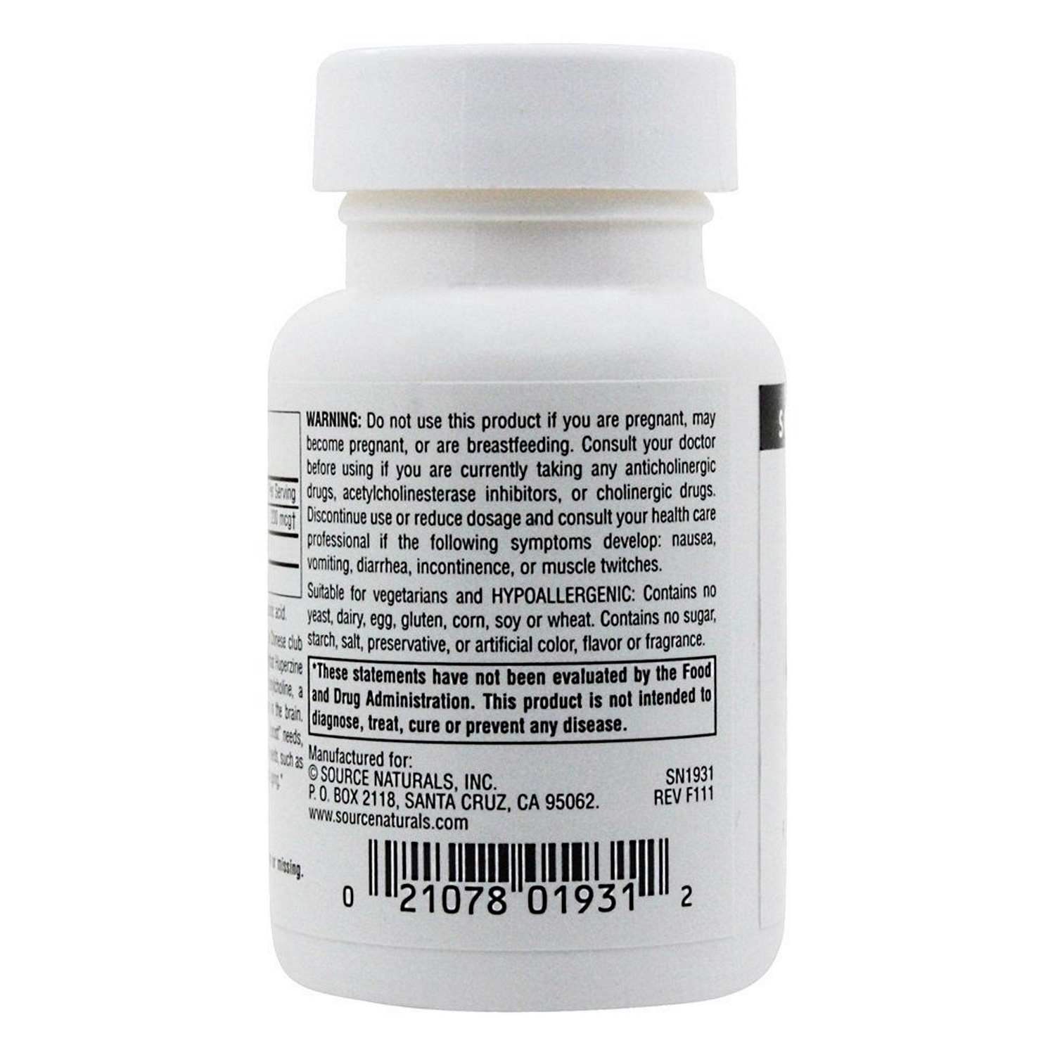 Huperzine A (Huperzia serrata leaf standardized extract). Other Ingredients: microcrystalline cellulose, and stearic acid.