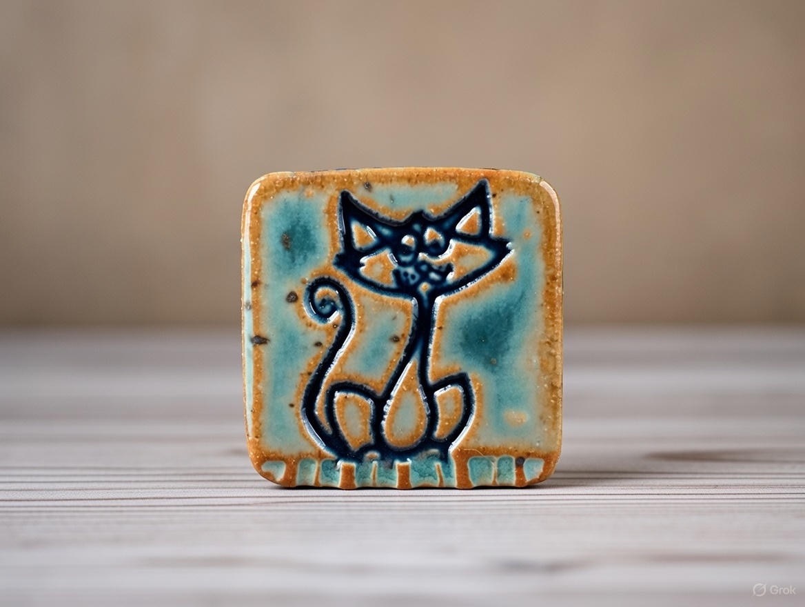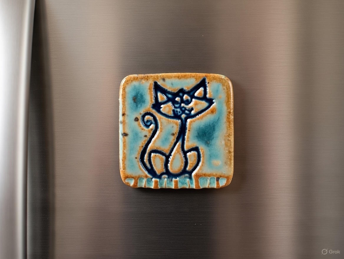 Add a touch of whimsy to your home with our Handcrafted Ceramic Cat Magnet! Featuring a charming cat with large, expressive eyes, pointed ears, and a playful curled tail, this magnet is perfect for cat lovers and art enthusiasts alike. The vibrant blue glaze with rustic brown edging gives it a unique, handcrafted look that stands out on any surface.