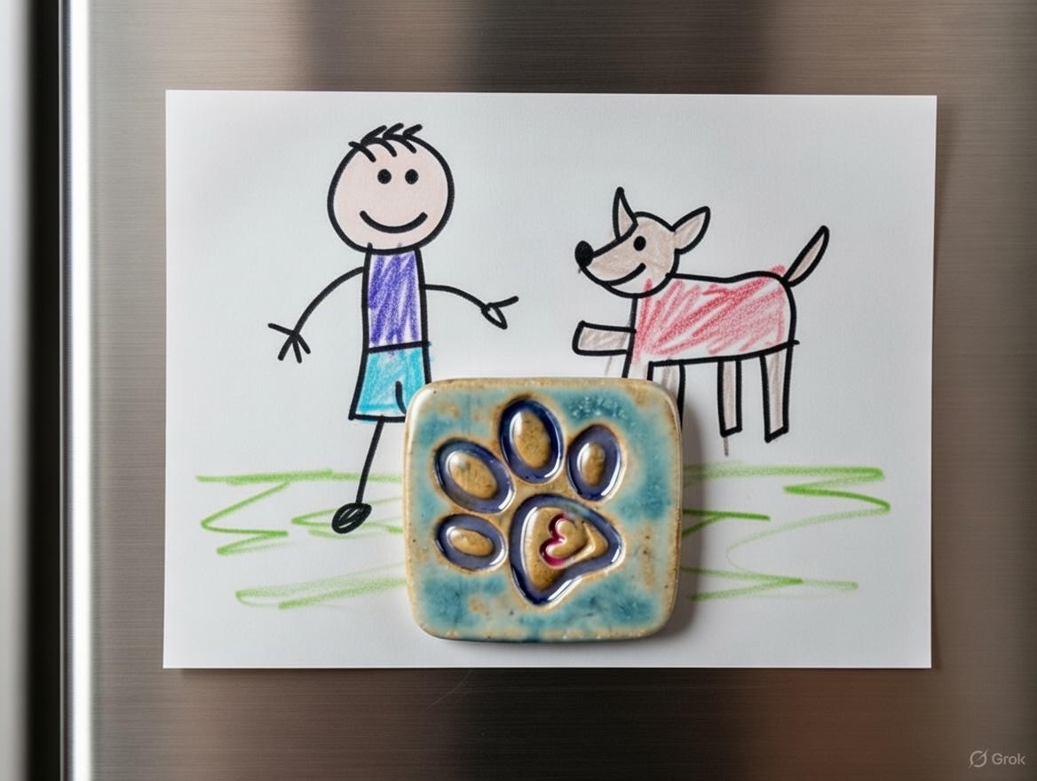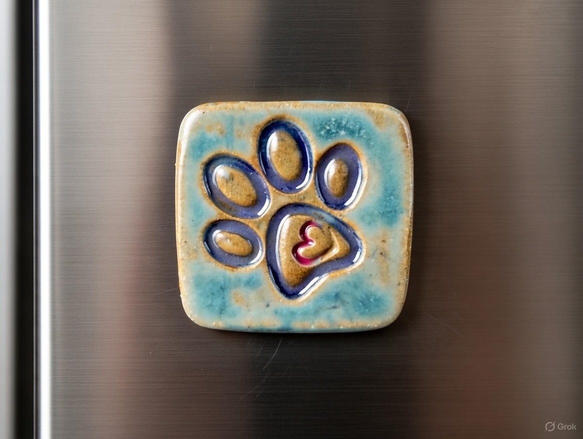 Add a touch of canine charm with our Dog Paw Refrigerator Magnet. This beautifully crafted magnet features three distinct dog paw prints, outlined in a rich blue color against a soothing background of light blue and earthy tones. Itโs the perfect blend of rustic elegance and personality.