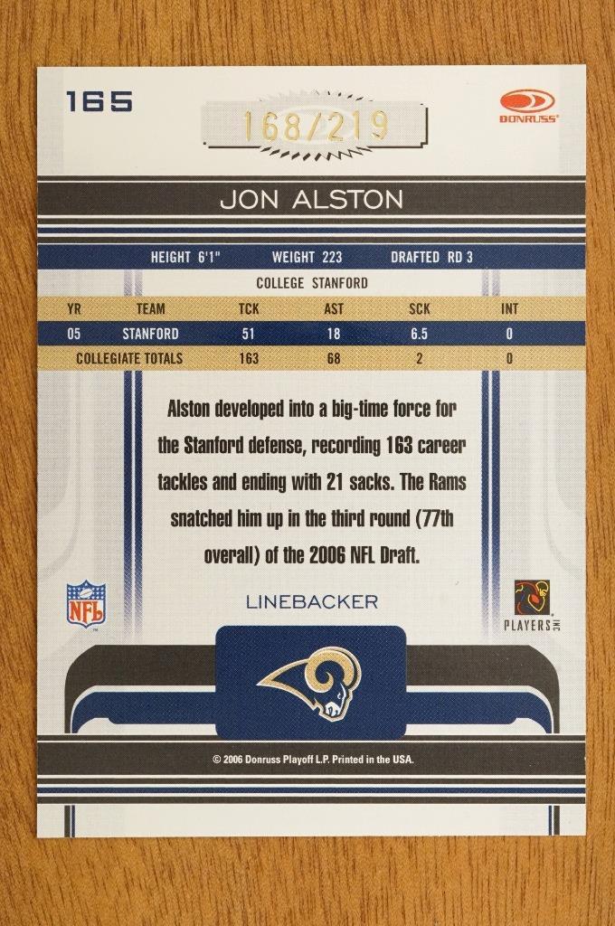 2006 Donruss Gridiron Gear Gold Signatures 168/219 Jon Alston #165 Rookie Auto