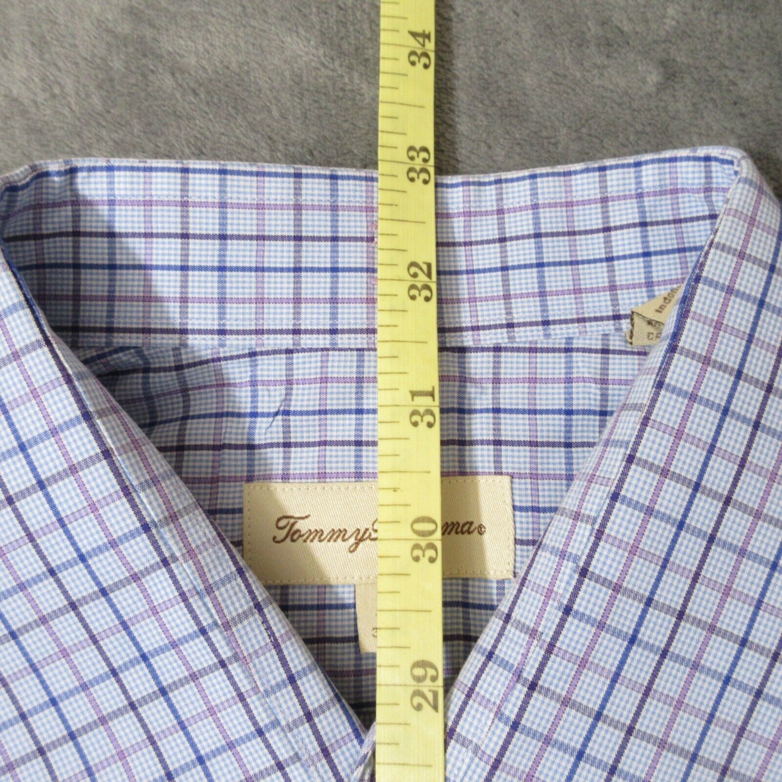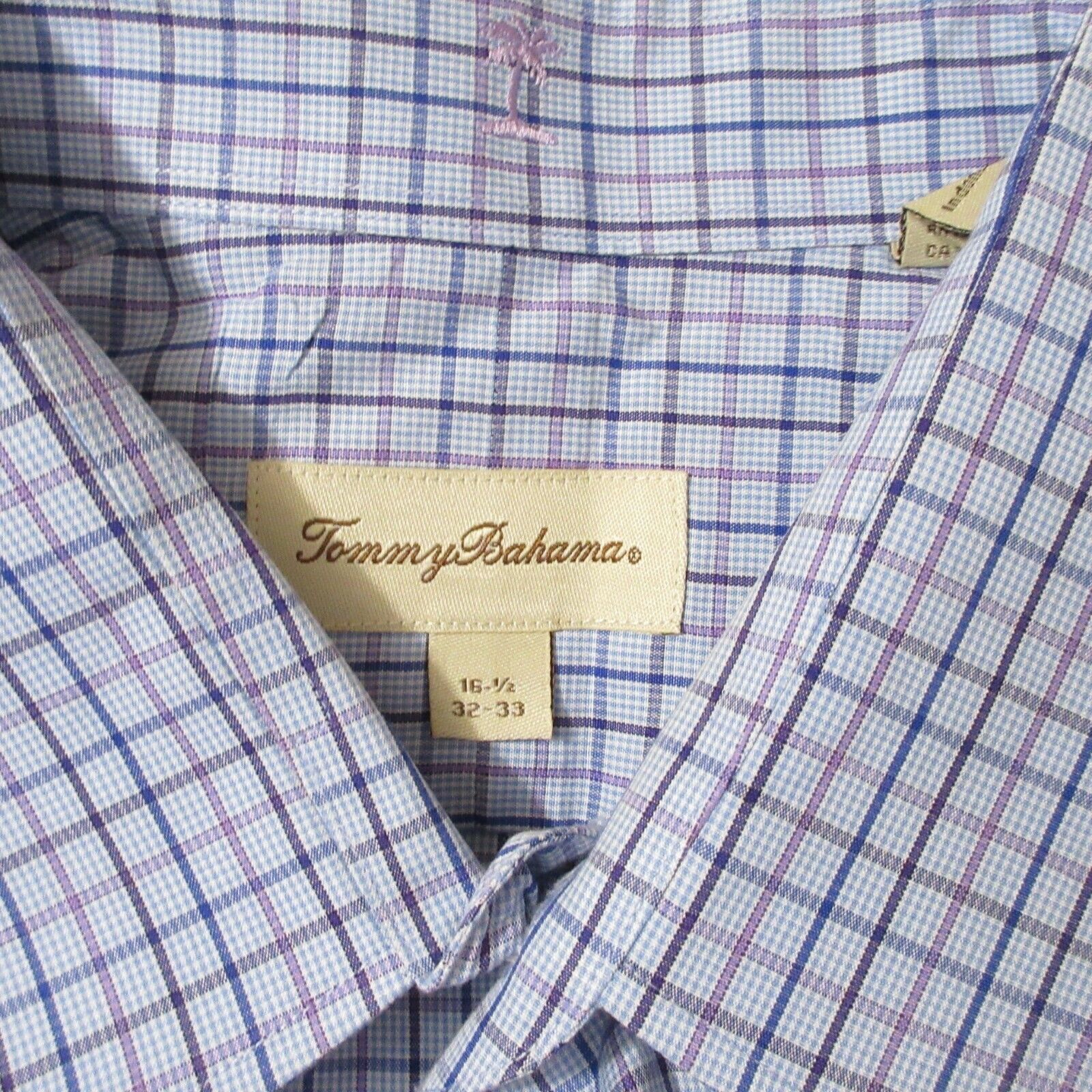 Brand: Tommy Bahama Size: 16 1/2, 32-33 Style: Button Front Dress Shirt Pattern: Check Sleeve Type: Long Sleeve Color: Blue / Purple Materials: 100% Cotton Condition: Very good condition, some cuff buttons have cracks in them but they have not fallen apart. Comments: Spelled out buttons, front pocket, two spare buttons of different sizes Per used clothing policy, all items have been cleaned.