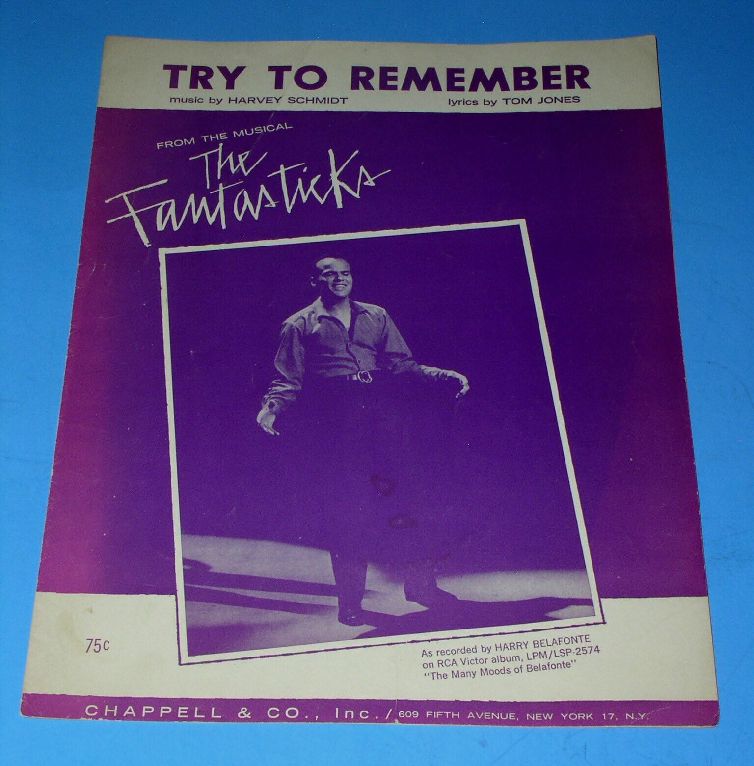 This is a vintage piece of sheet music entitled, "Try To Remember" as recorded by Harry Belafonte. Dated 1960 Chappell Co., Inc. From the musical The Fantasticks. A terrific item for the collector.