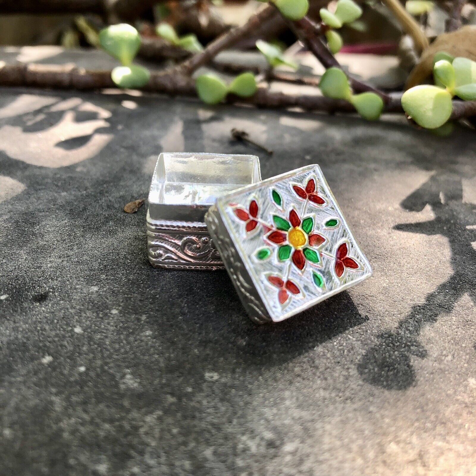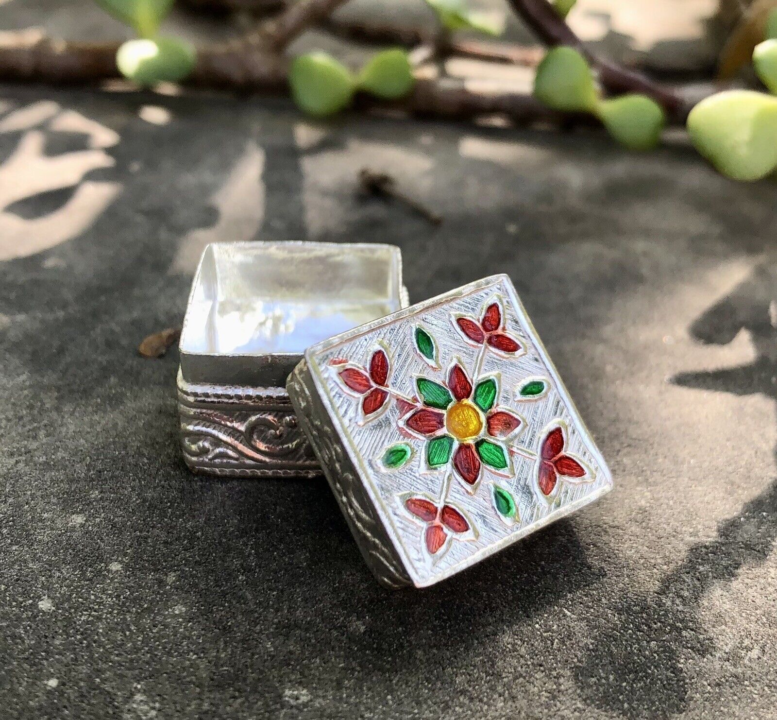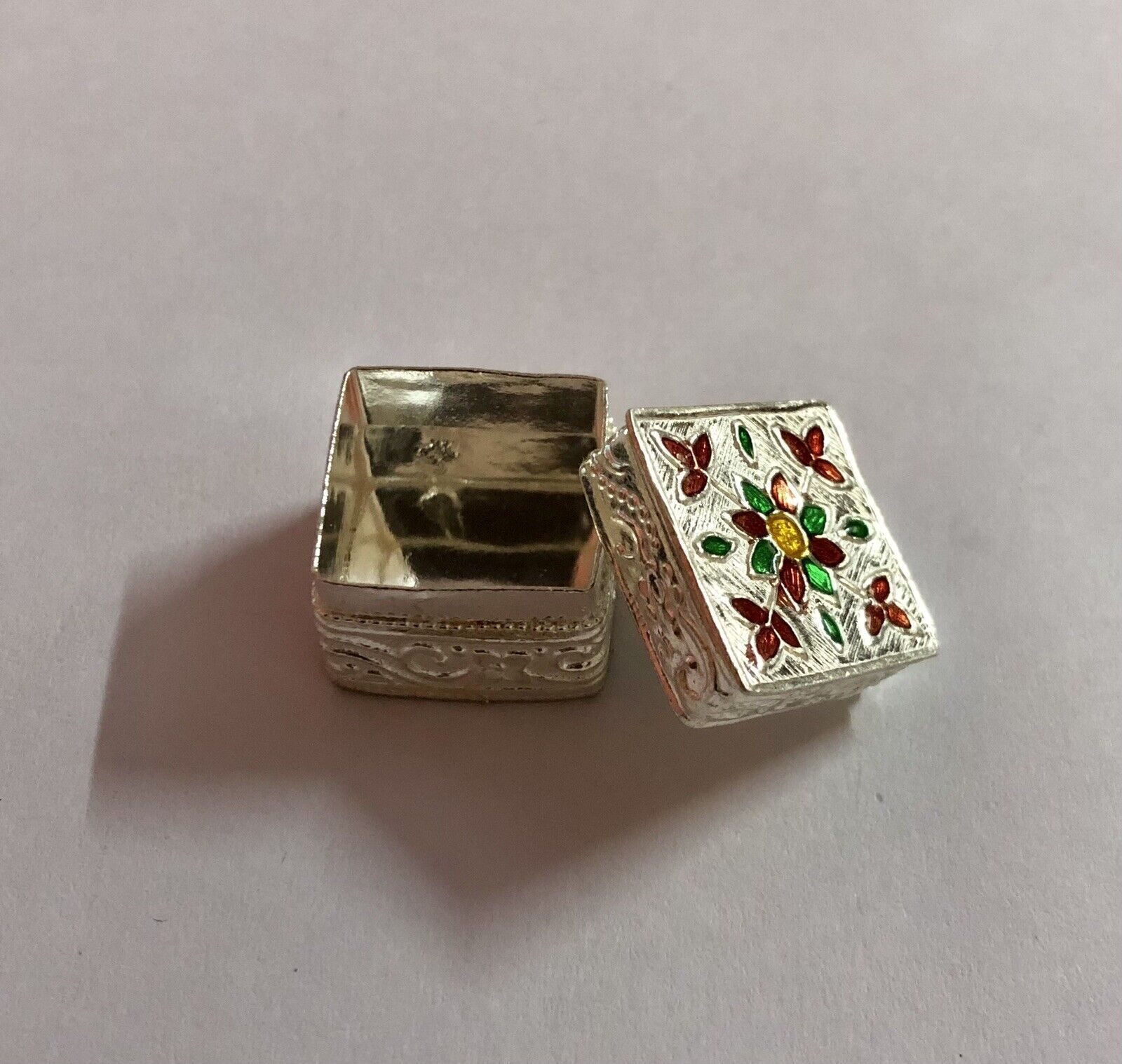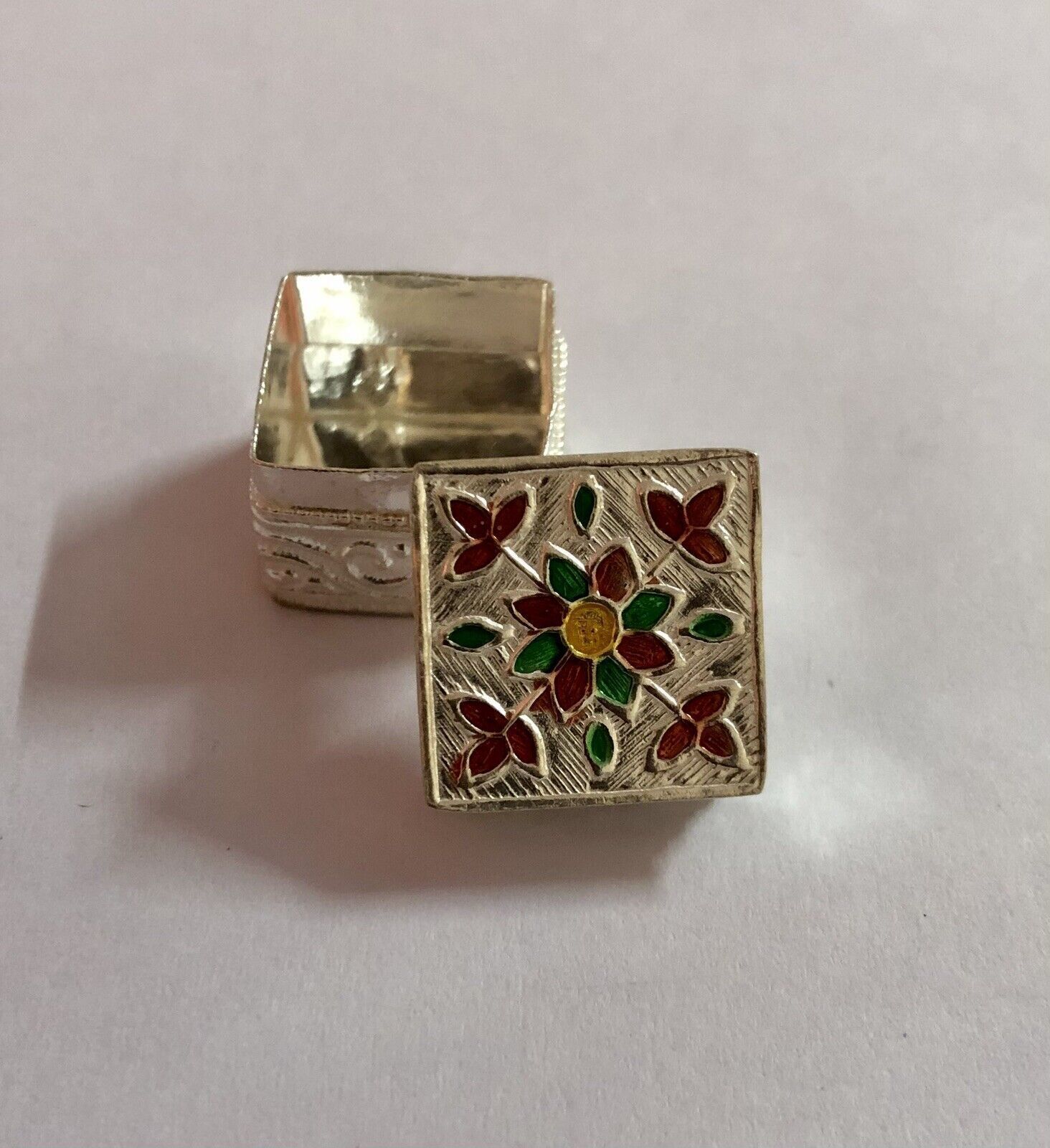 C'e un bellissimo smalto su di esso. Questa e una scatola interamente fatta a mano e puo presentare poche differenze. Il colore dello smalto puo variare leggermente.