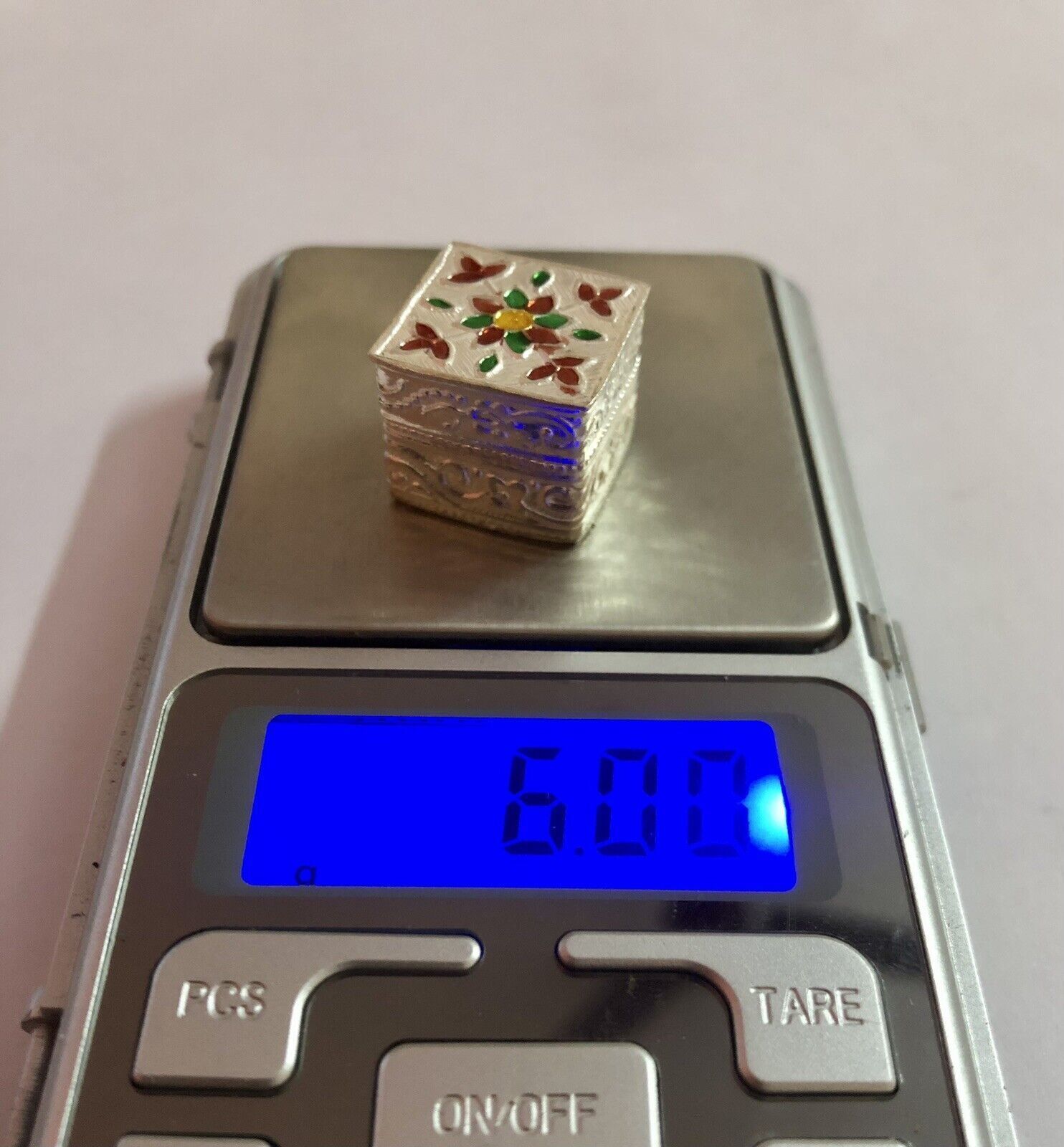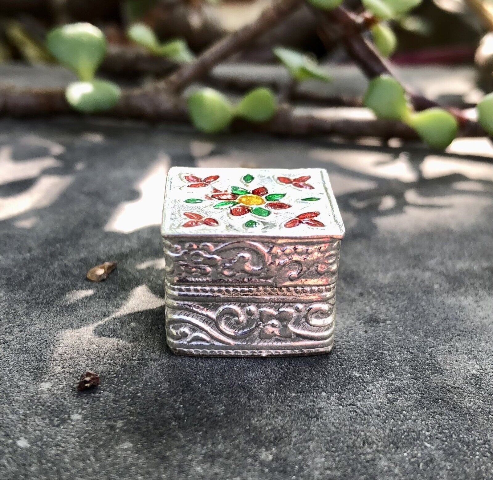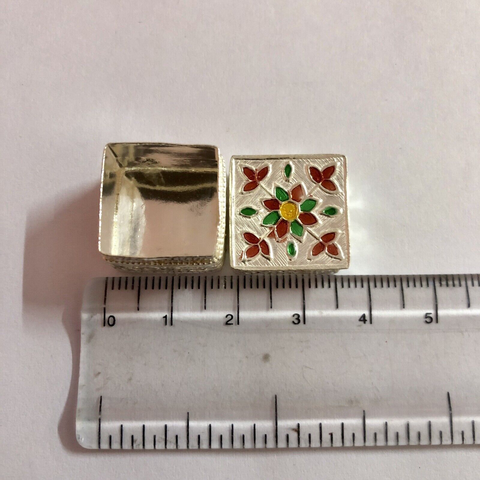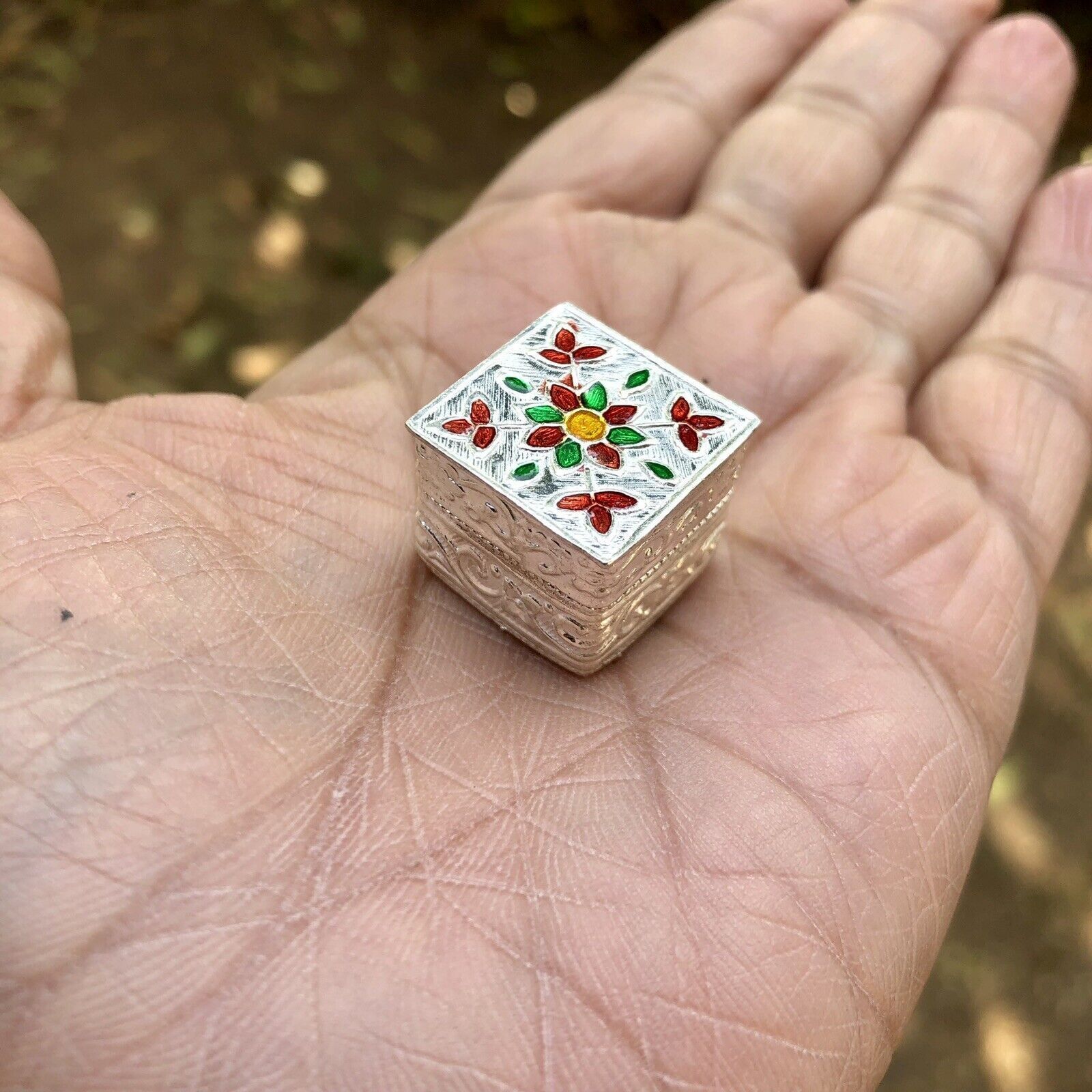 C'e un bellissimo smalto su di esso. Questa e una scatola interamente fatta a mano e puo presentare poche differenze. Il colore dello smalto puo variare leggermente.