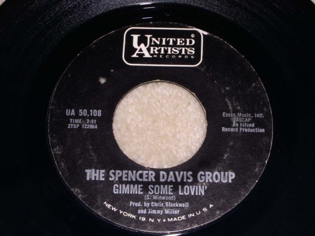 This is the original, vintage 45 rpm, United Artists #UA 50,108 release of The Spencer Davis Group's, "Gimme Some Lovin'". Flipside: "Blues In F". A terrific addition to that 45 rpm stack becoming re-popularized with the sale of those new phonographs being sold everywhere. There is no substitute for the "look" and "feel" of the old 45. This will surely bring back those memories.