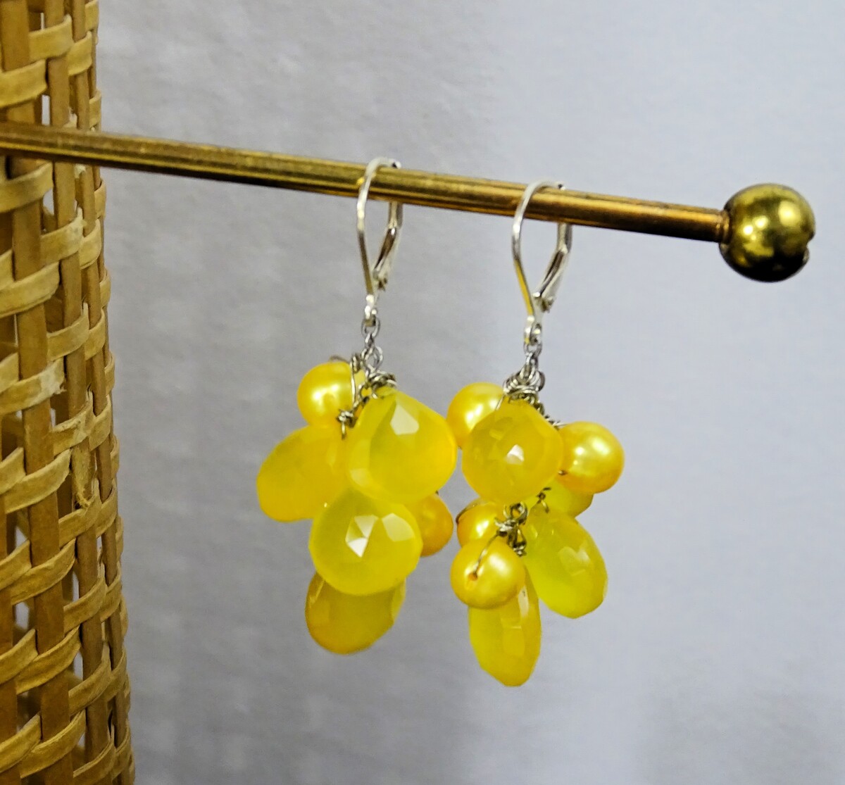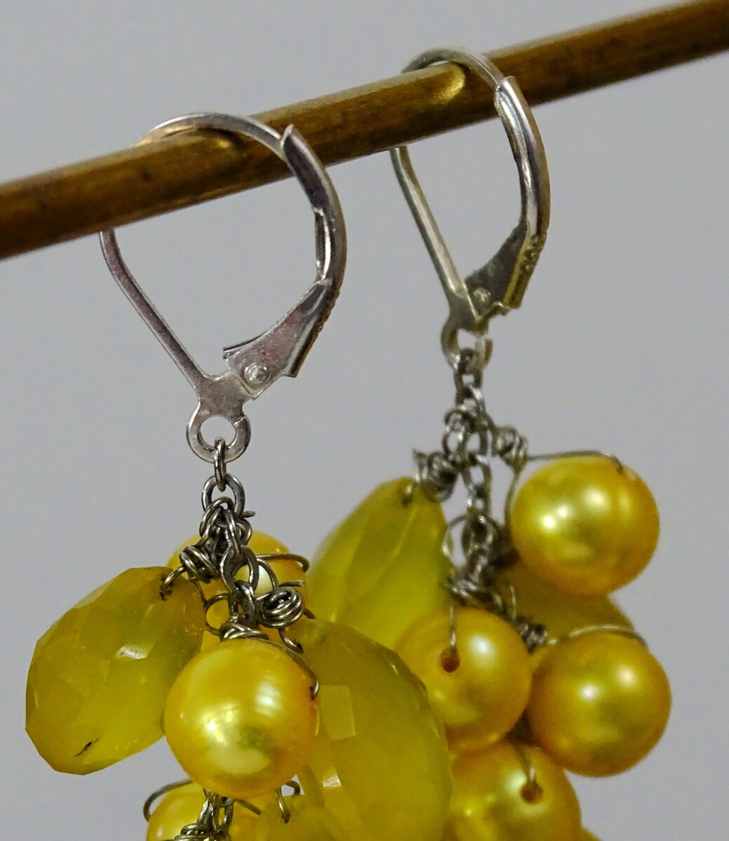 Lemon Chalcedony and Yellow Pearl Sterling Silver Leverback Drop Cluster Earrings. One owner - lightly worn if at all. Nicely cared for. Very pretty combination of a pearl like bead and textured prism Chalcedony wide tear drop. Leverback is marked 925. Just over 1 3/4" long, not quite 2".The wide tear drop bead is 1/2" wide. Pearl beads are 1/4" wide. Nicely constructed handmade item.