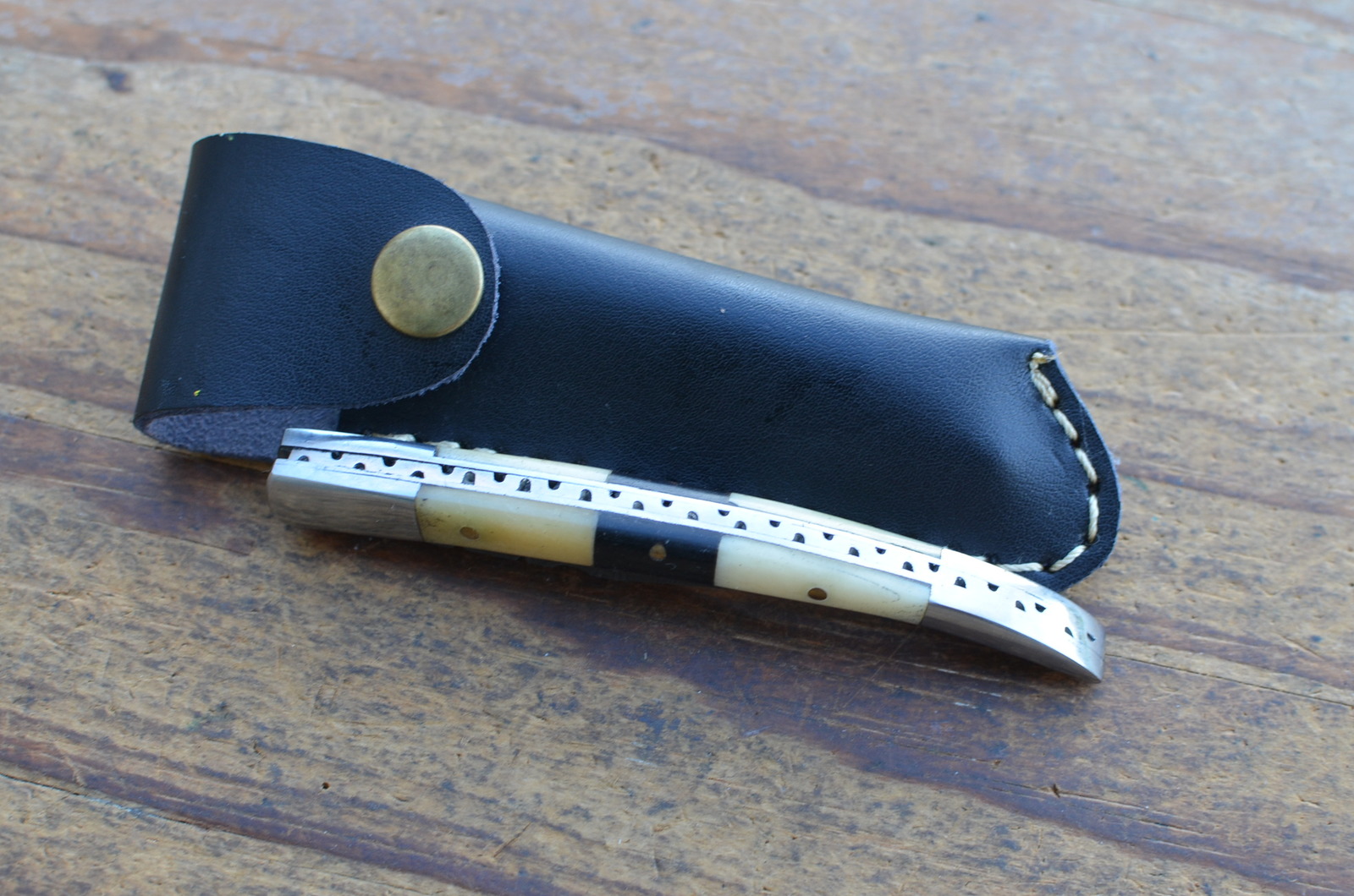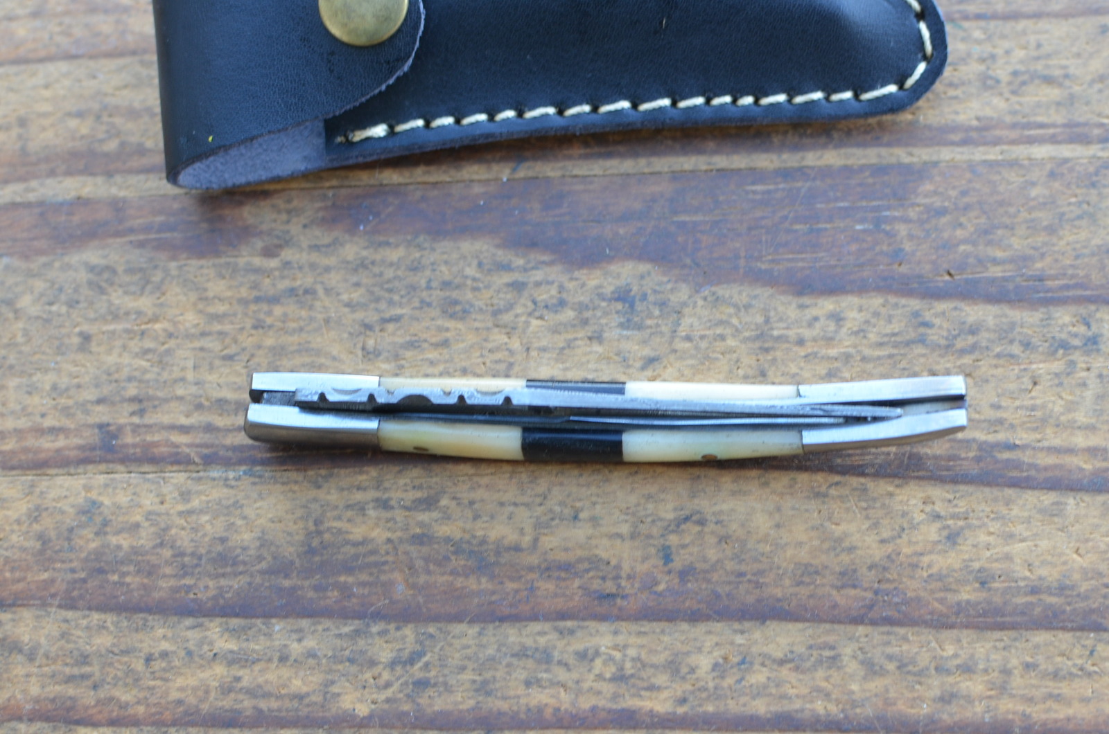 Handle is made of buffalo horn and camel bone with double steel bolsters steel liners and pins.