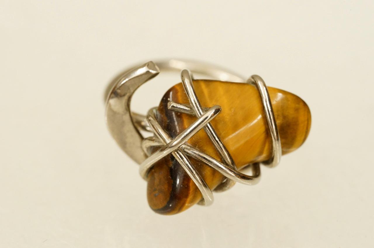 Vintage Costume Jewelry Wrapped Tigers Eye Silver Tone Metal Ring Size 7