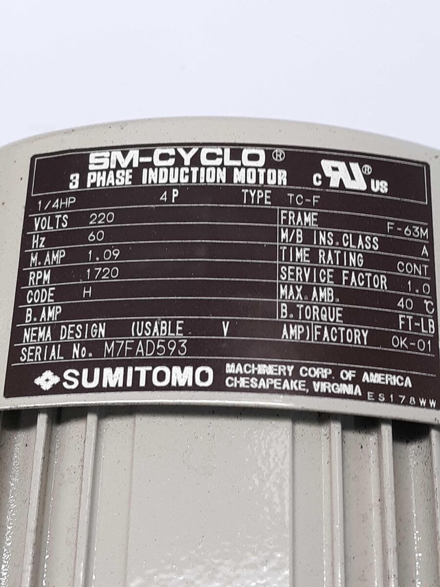 Sumitomo TYPE TC-F /CNHM02-5077-29 SM-Cyclo®Induction Motor, 0.25HP Frame F-63M