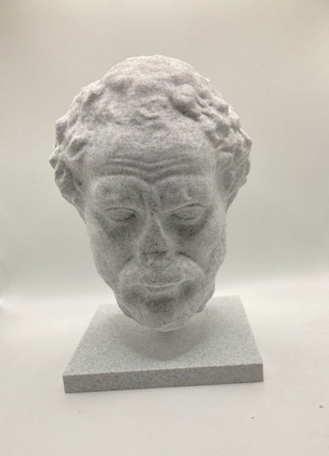 Made of cast stone. Cast stone is a type of gypsum cement whose properties are much different from plaster of paris which is what most sculpture shops use. Unlike plaster, which is soft, light and weak, cast stone is hard, heavy and strong. Cast stone feels like, and is heavy like a real stone would be, which can be experienced as soon you try to lift it.