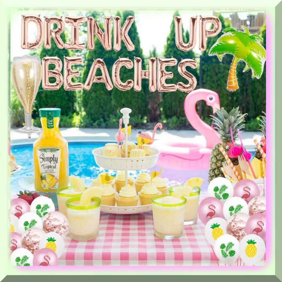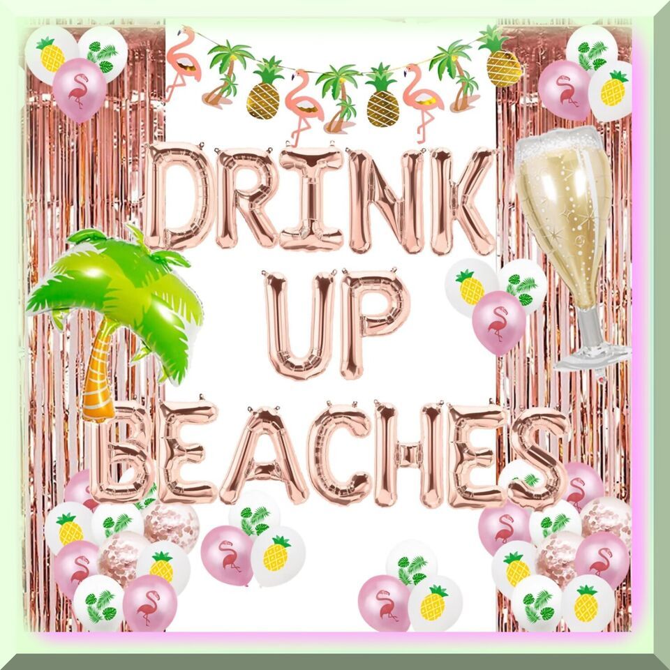 A. APPLICATION: Dive into the tropical vibes with Drink up beaches party supplies! Perfect for transforming any occasion into a Hawaiian luau party, Summer beach party, bachelorette bash, bridal shower extravaganza, hen party, and more. Get ready for an unforgettable experience that will transport you to paradise!
