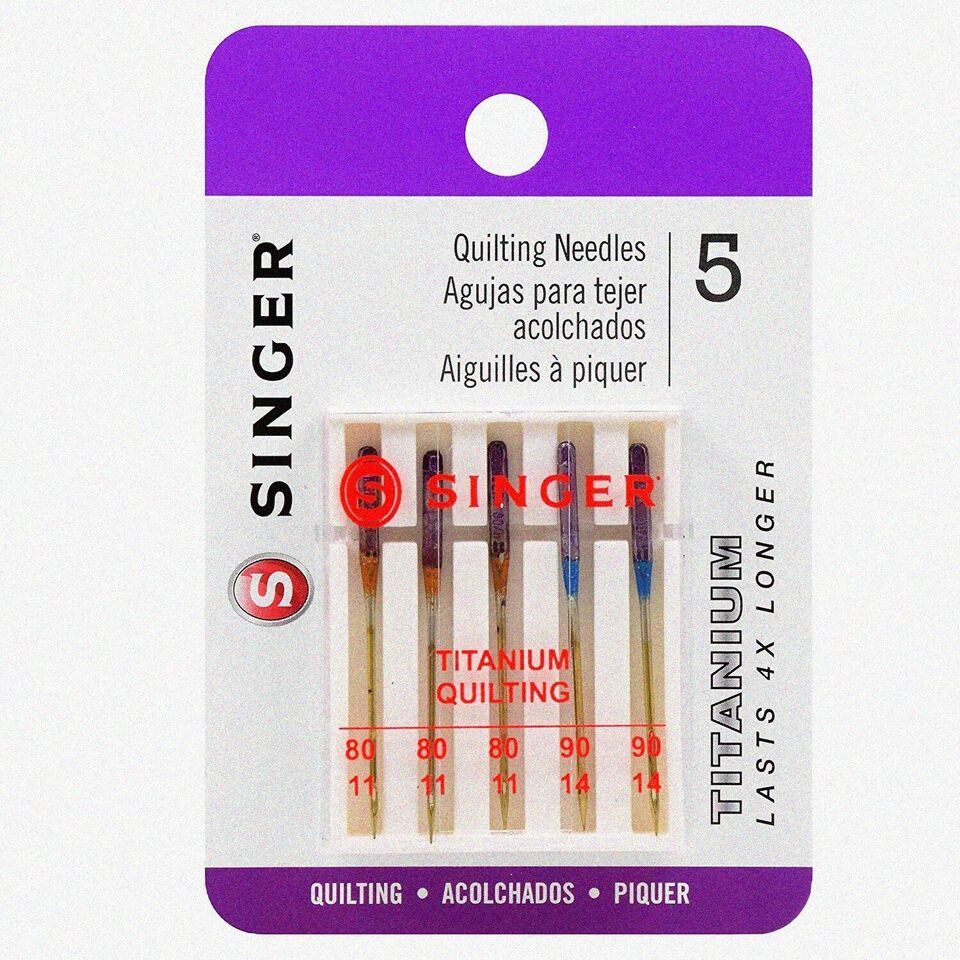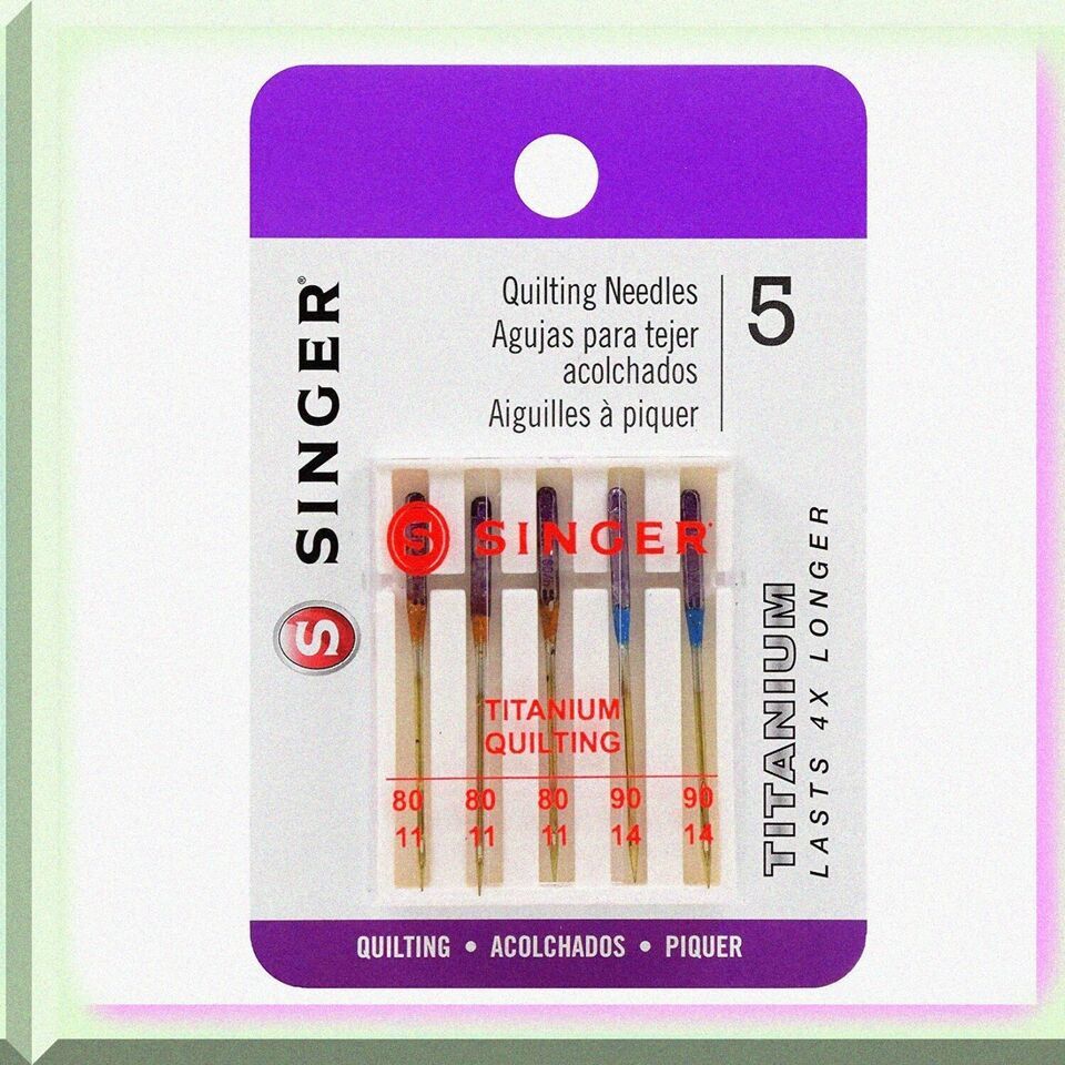 Elevate your quilting game with our Quilting Titanium Machine Needles! This 5-count pack includes 3 size 80/11 and 2 size 90/14 needles, perfect for all your quilting, blanket, and patchwork projects. Designed to fit most sewing machines, including Kenmore, these color-coded needles ensure easy size selection. Titanium coating prevents thread breakage, even at high speeds. Keep your sewing kit ready for any project with these durable, high-performance needles! ==== FEATURES: ==== (A) **Unmatched Durability**: Our Quilting Titanium-coated Machine Needles are engineered to last! With a lifespan that's 4 times longer than regular sewing machine needles, these super-strong needles ensure you spend more time creating and less time replacing. The titanium coating not only enhances durability but also provides a smoother sewing experience, making them an indispensable tool for any quilting enthusiast.