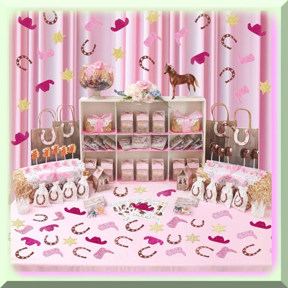 Cowgirl Party Decorations: A dazzling assortment of 50 pieces of rose red glitter cowgirl hat confetti, 50 pieces of brown glitter horseshoe confetti, 50 pieces of gold glitter six-point star confetti, and 50 pieces of pink glitter cowgirl boot confetti.