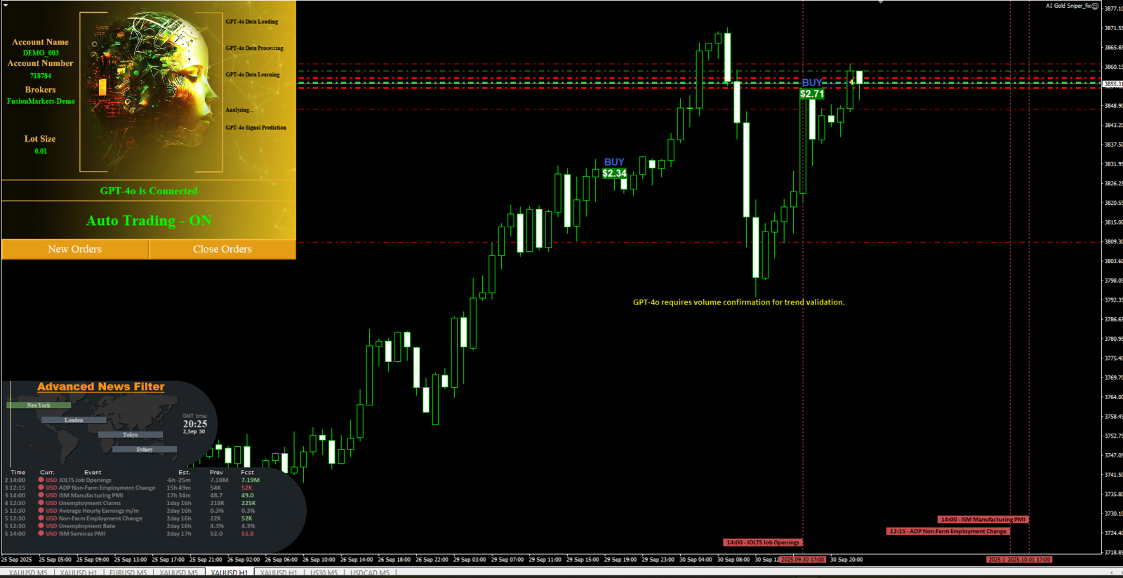 AI Gold Sniper is an advanced expert advisor built for MetaTrader 4, designed exclusively for XAUUSD trading. It integrates the GPT-4o model with deep learning techniques such as CNN, RNN, and reinforcement learning to process historical price data, macroeconomic indicators, and real-time news. The EA adapts dynamically to market conditions by combining sentiment analysis, technical filters, and fundamental signals. With its robust framework, it delivers consistent results without relying on risky methods like martingale or grid strategies.