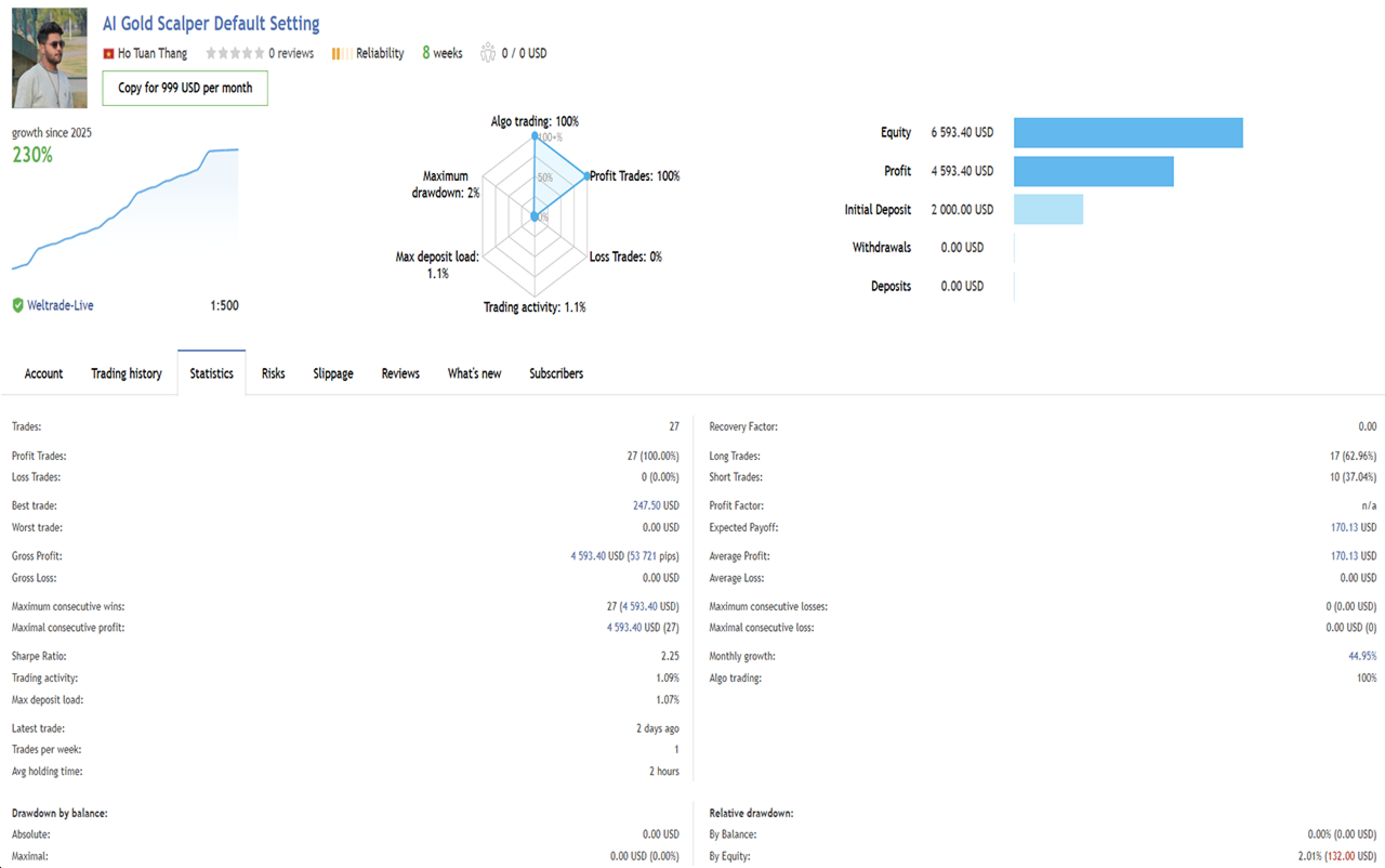 This Expert Advisor is developed by Ho Tuan Thang, who brings over 9 years of experience forex ea robot on MQL5 to the table. He has worked on several notable products, including Advanced Triangle Trading MT4, Quantum HFT Prop Firm, AI Indices Scalper, and the highly successful AI Gold Sniper, which stands out as his top-performing creation.