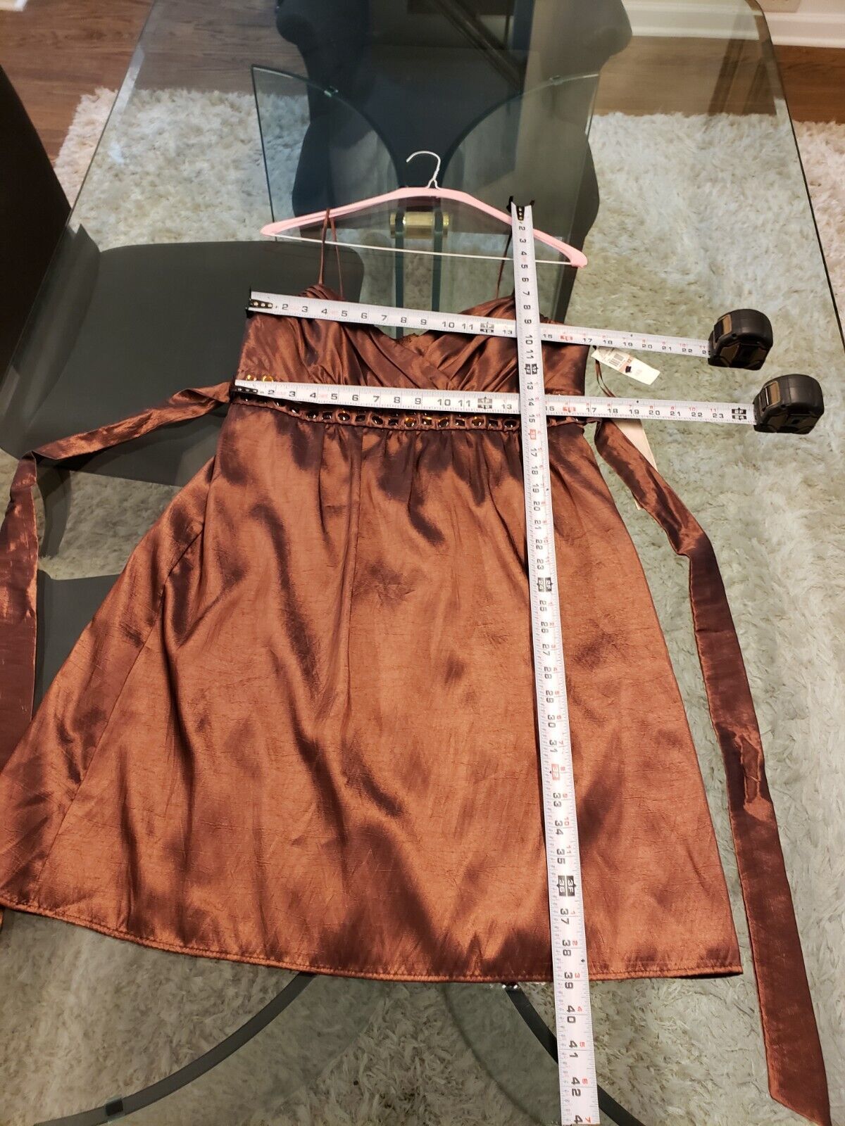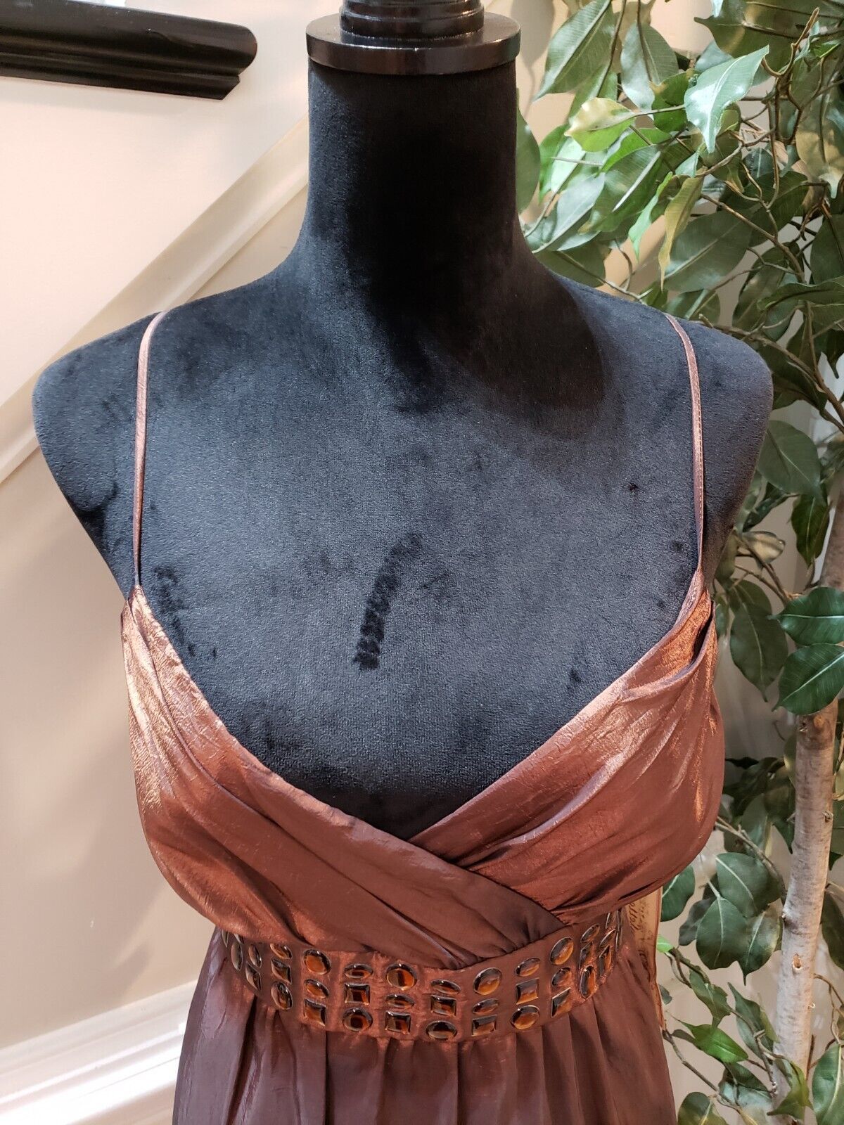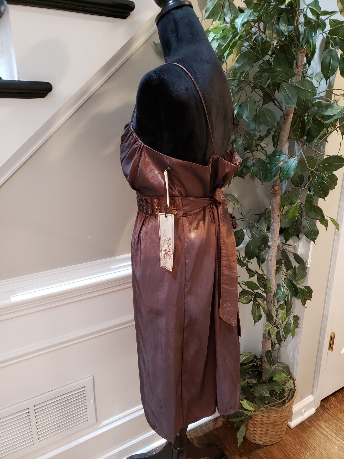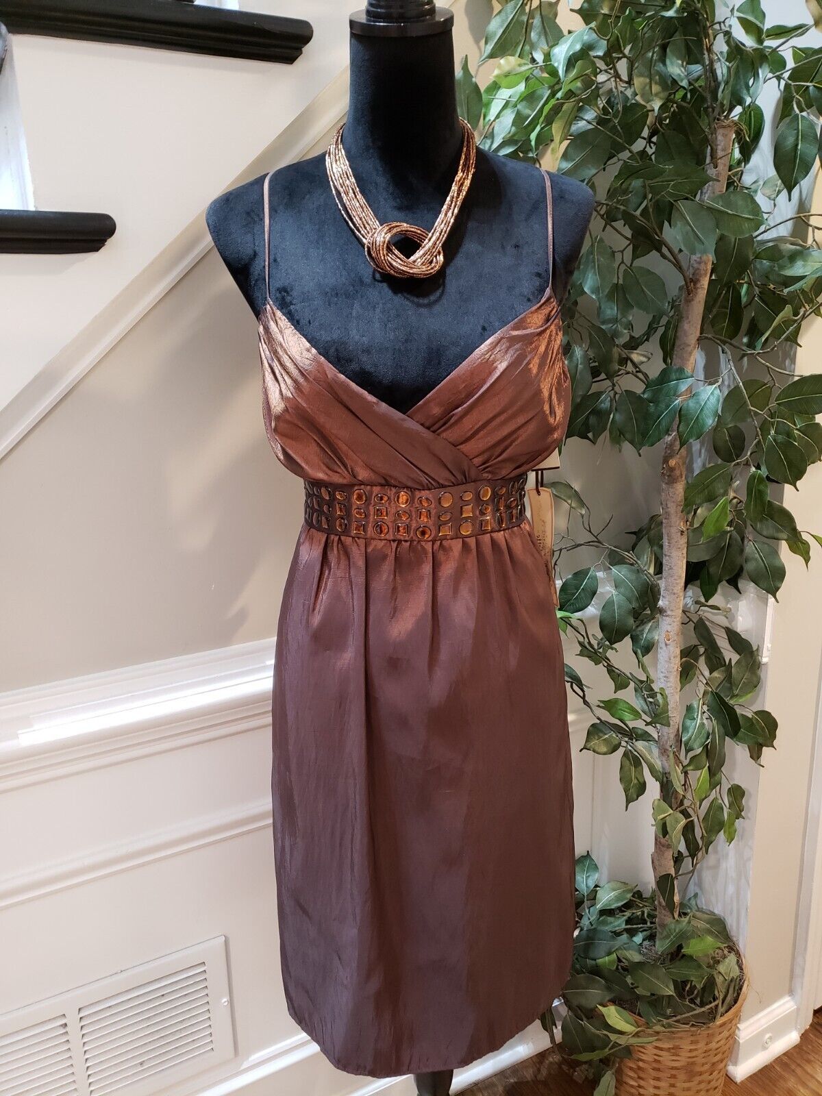 Roulette Women Brown Belted Spaghetti Straps Surplice Neck Knee Length Dress 12.