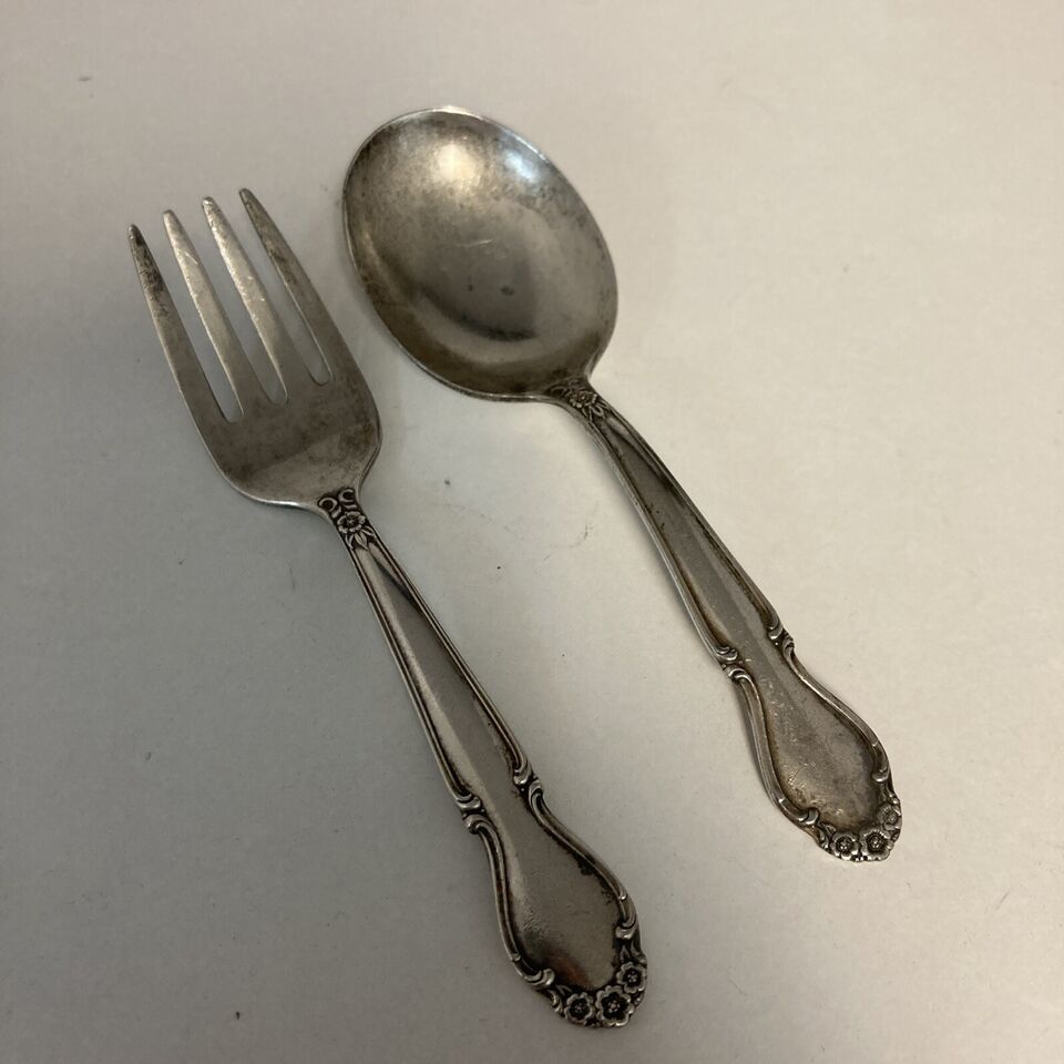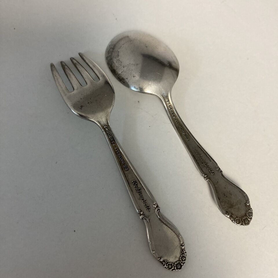 Rogers Sterling Silver ?Wedding Bells? Baby Fork And Spoon Set No Mono 4.25?.