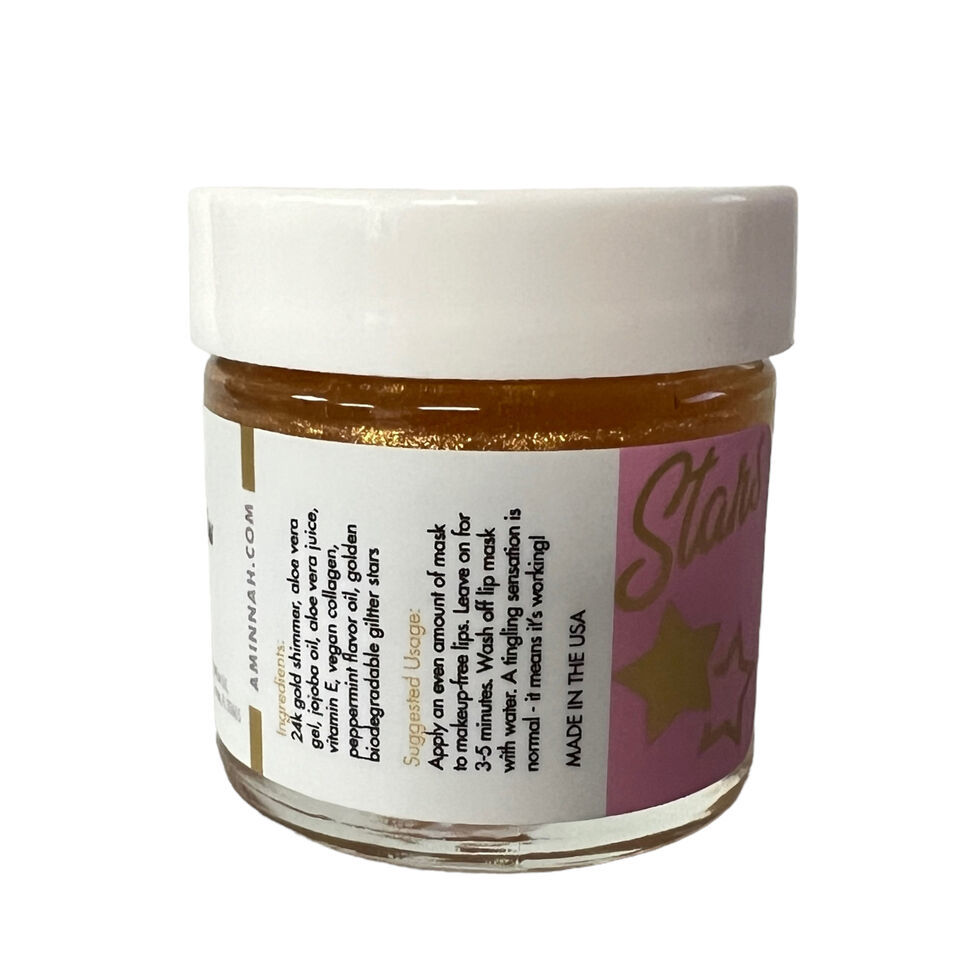 Kiss The Stars lip mask is made up of 24k Gold Shimmer, Aloe Vera gel, Jojoba oil, Aloe Vera Juice, Vitamin E, Vegan Collagen, Peppermint Flavor Oil, Golden Biodegradable Glitter Stars.