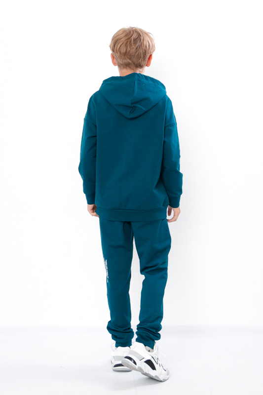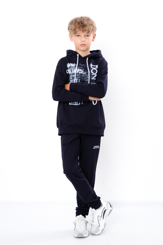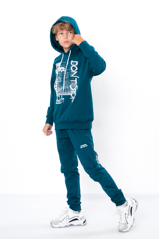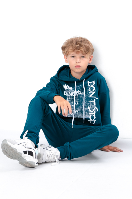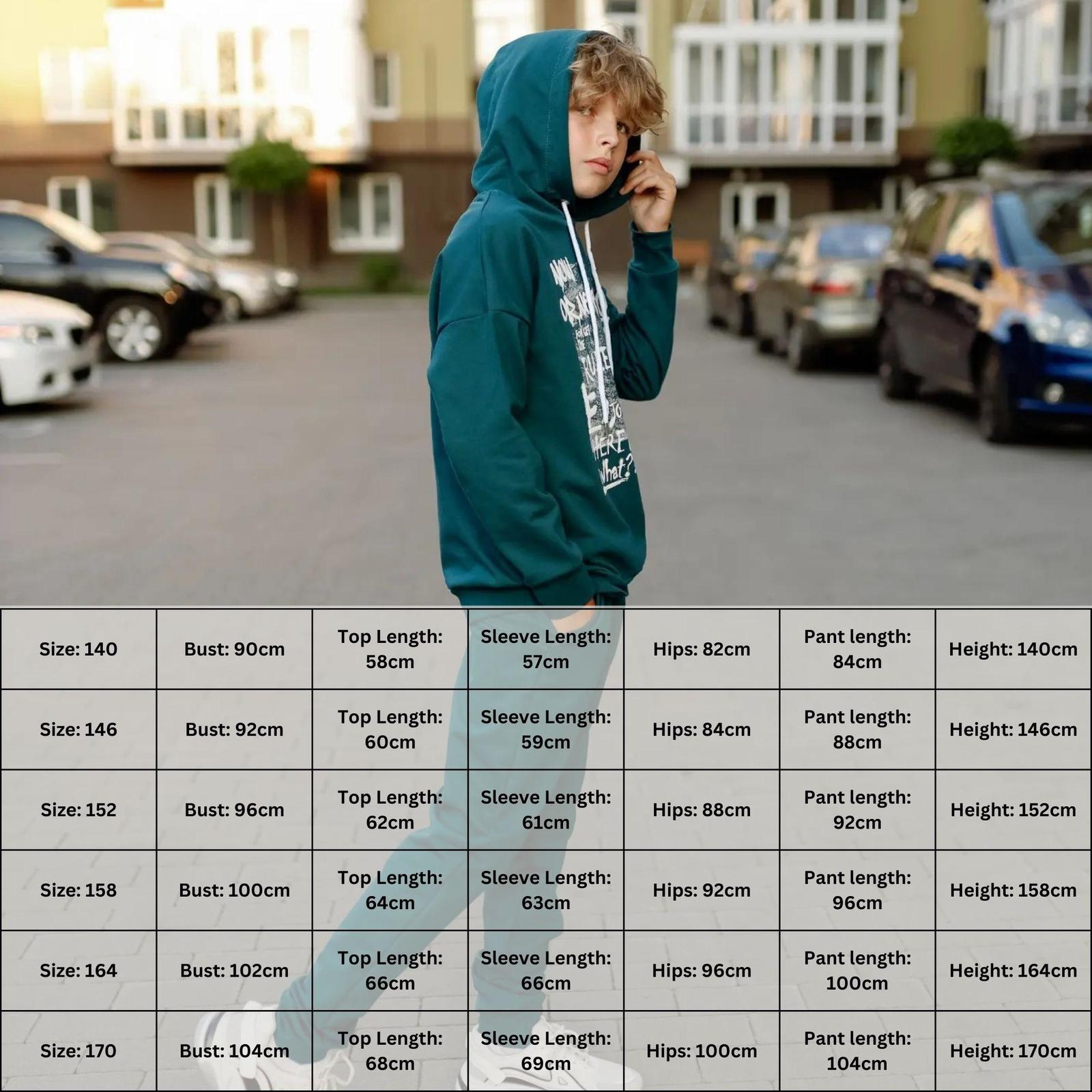 The teenage boys' suit is made from solid-colored double-thread fabric. The suit consists of a hoodie and pants. The hoodie features a hood and wide elastic cuffs on the sleeves and bottom. The pants have a wide, comfortable waistband and two side pockets. Both the pants and the front of the hoodie are adorned with a stylish printed design. The suit can be paired with sneakers or canvas shoes. It is suitable for everyday wear, sports activities, or active outings. The fabric is of good quality, so with proper care, the garment can be worn for more than one season. It may shrink after washing.