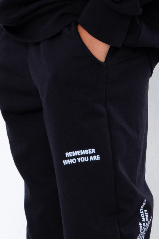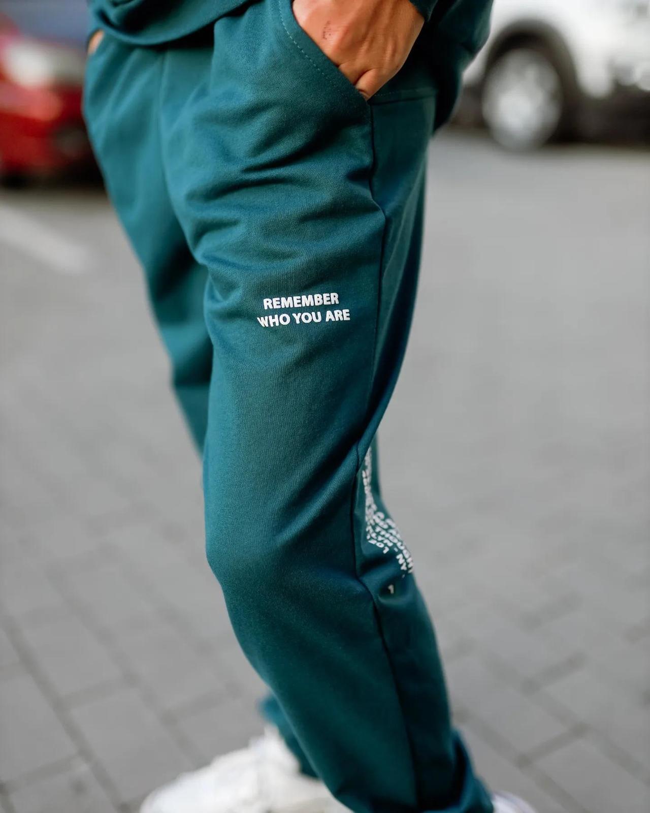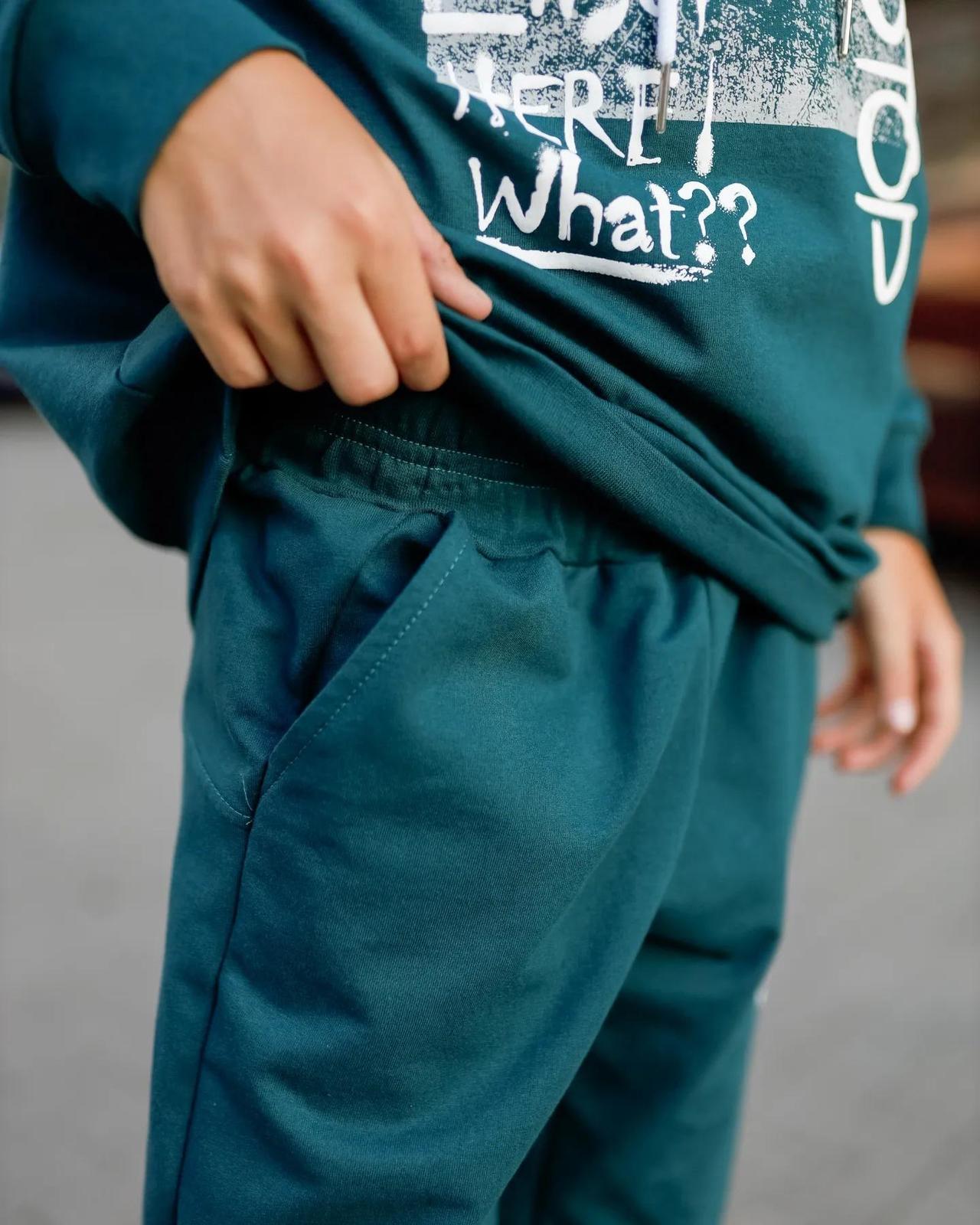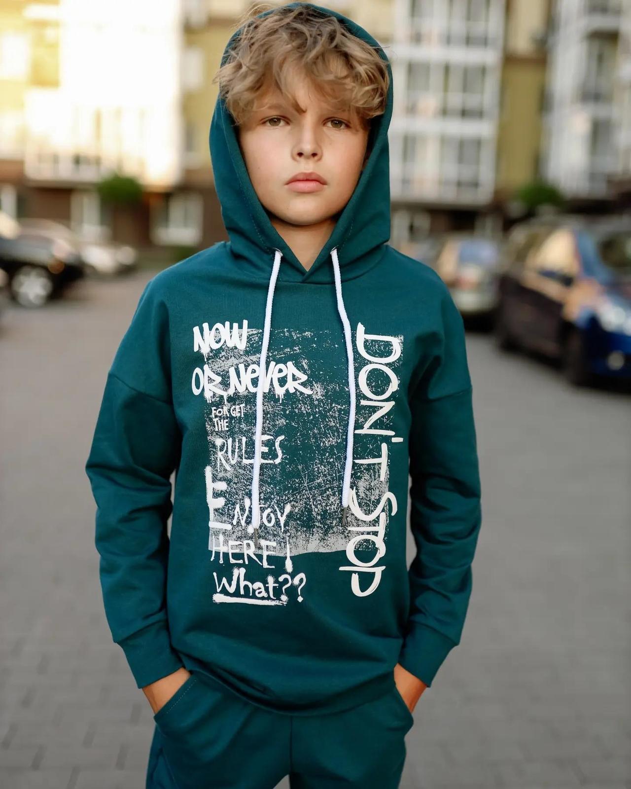 The teenage boys' suit is made from solid-colored double-thread fabric. The suit consists of a hoodie and pants. The hoodie features a hood and wide elastic cuffs on the sleeves and bottom. The pants have a wide, comfortable waistband and two side pockets. Both the pants and the front of the hoodie are adorned with a stylish printed design. The suit can be paired with sneakers or canvas shoes. It is suitable for everyday wear, sports activities, or active outings. The fabric is of good quality, so with proper care, the garment can be worn for more than one season. It may shrink after washing.
