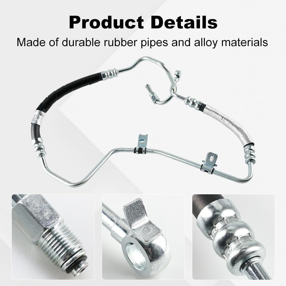 The power steering pressure hose assembly has passed the high pressure test before leaving the factory, to ensure that the installation and operation of the new hose are trouble free The steering tubing is made of multi layer reinforced rubber and is provided with a layer of highly oil resistant, ozone resistant and heat resistant synthetic rubber coating and tubing assembly are made of steel and surface anti corrosion coating, with strong corrosion resistance and rust resistance Replacement for OEM part number: 3401197, 44410-0E012, 44410-48120, 44410-48121, 44410-48141. Compatible with Toyota Highlander V6 3.3L 2004 to 2007, Lexus RX330 V6 3.3L 2004 to 2006 Match equipment, plug and play, easy to replace, OEM anastomoses can be directly replaced, simply remove your damaged steering hose to install Manufactured according to strict quality control standards. Please confirm that your car can use it before buying, otherwise it is very bad. We do not provide installation instructions, we recommend professional installation