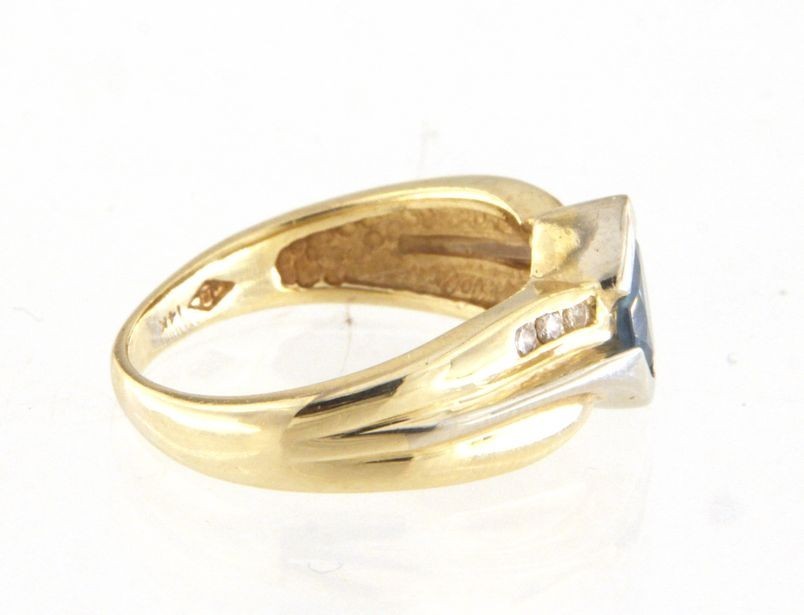 Type: Solitaire ringWeight: 4Karat: 14ktMetal: Yellow and White GoldGender: Women'sStyle: SolitaireSize / Length: 8Owner applied: 14k JAIStone 1 quantity: 1Stone 1 shape: OvalStone 1 color: BlueStone 2 Quantity: 6Stone 2 Shape: RoundStone 2 Color: ClearStone 1 weight (total): .75Stone 2 Weight (Total): .05Stone 2 Type: DiamondCondition:Used