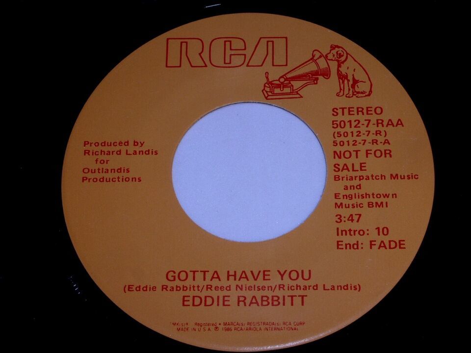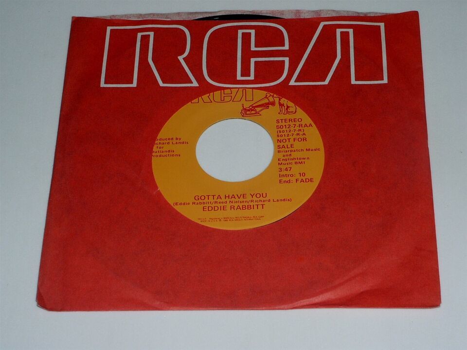 This is an original, vintage promotional 45 rpm phonograph record by Eddie Rabbitt entitled, "Gotta Have You". Same flipside. Record label RCA 5012-7-RAA. Comes in its original RCA paper sleeve as shown.