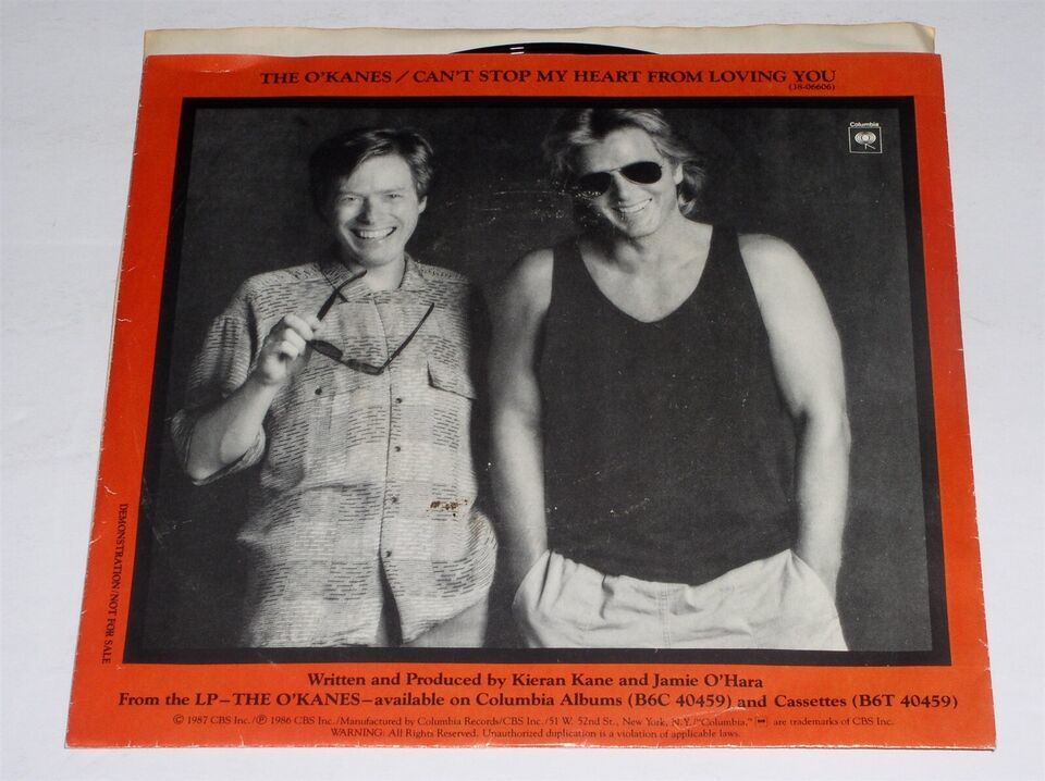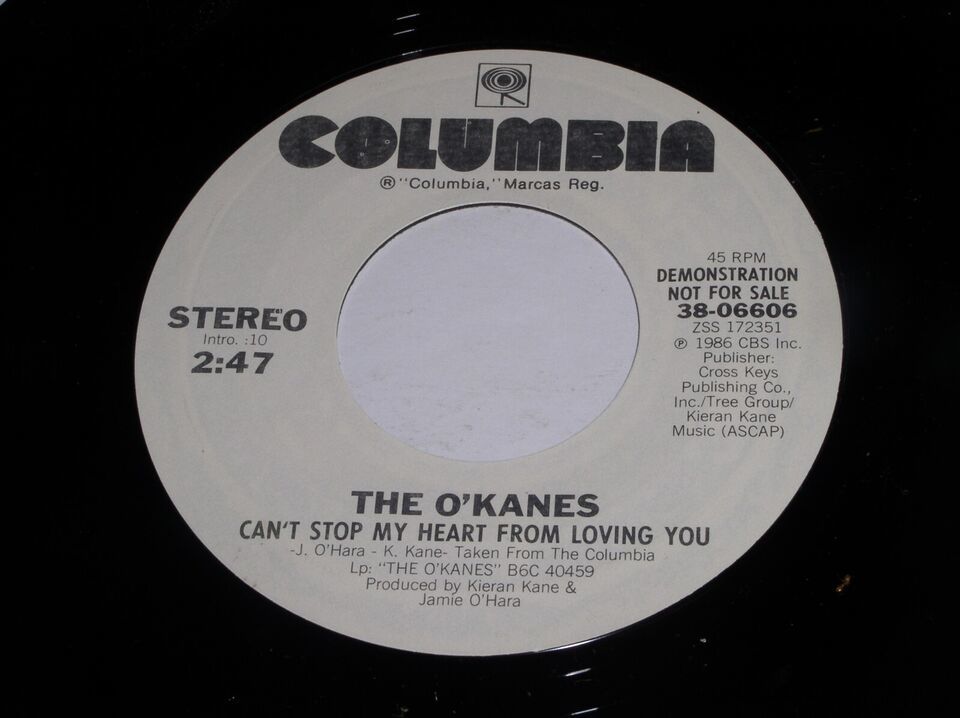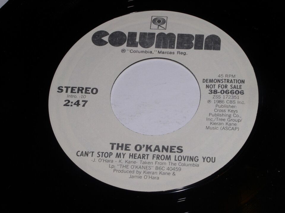 This is a vintage, promotional 45 rpm phonograph record by The O'Kane's entitled, "Can't Stop My Heart From Loving You". Same flipside. Record label Columbia 38-06606. Comes with its original picture sleeve as shown.