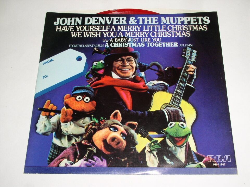 This is a vintage red vinyl 45 rpm phonograph record by John Denver The Muppets, entitled, "Have Yourself A Merry Little Little Christmas/We Wish You A Merry Christmas". Flipside: "A Baby Just Like You". Record label: RCA PB-11767.