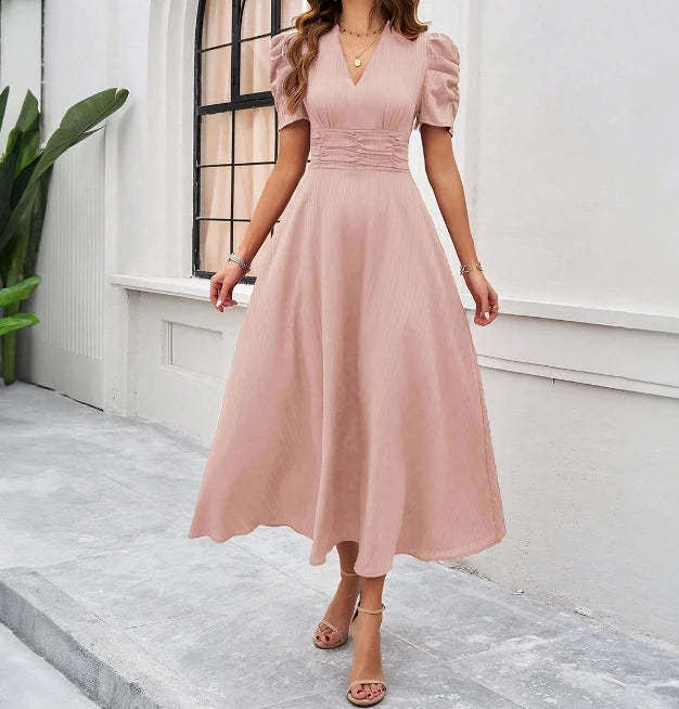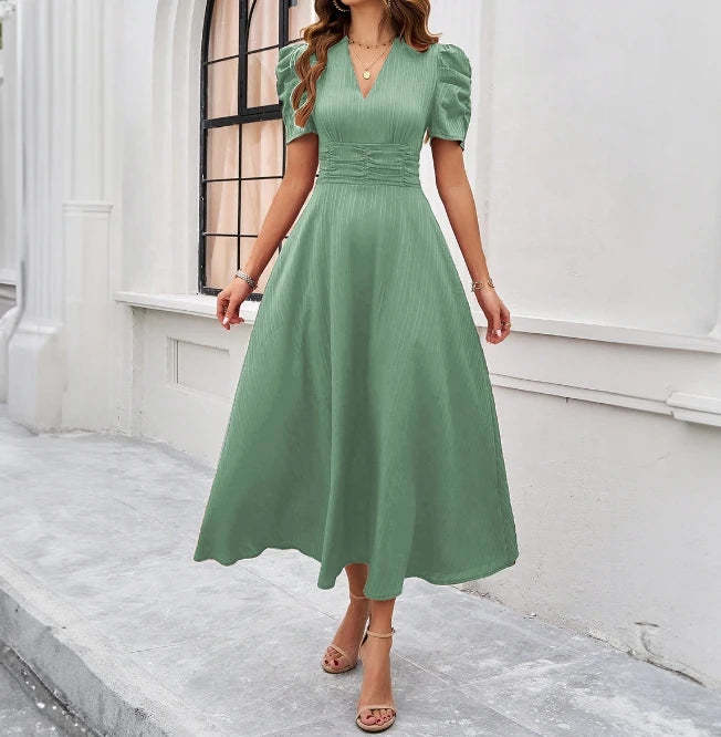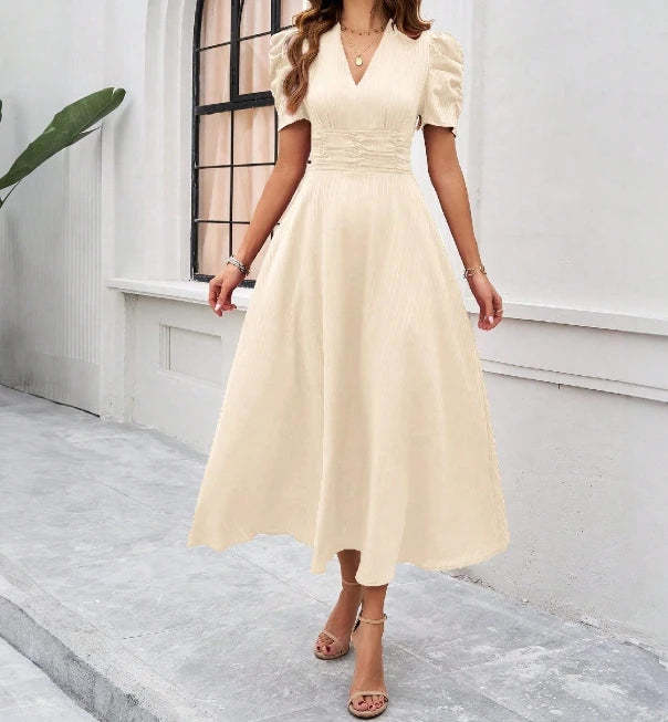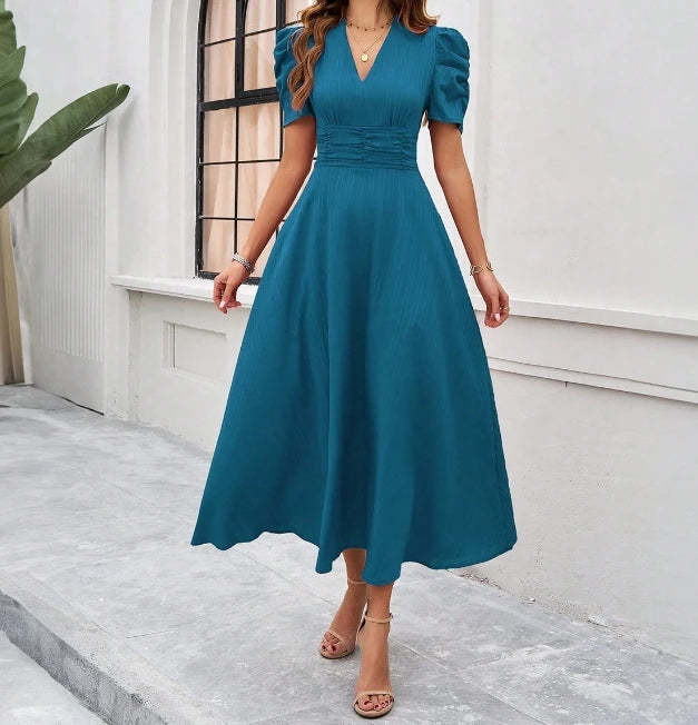 New Fashion 2024 Summer Casual Bubble Sleeve Short Sleeve V-Neck Solid Color Wai