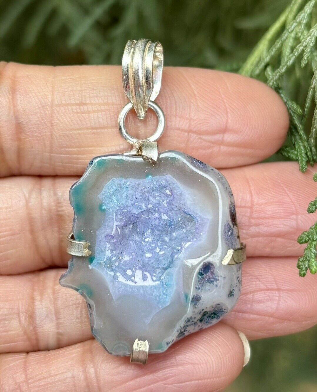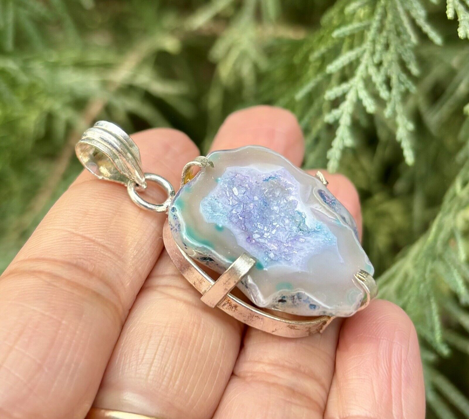 Pendentif en pierre agate géode druzy bleu indigo plaqué argent sterling 925 7