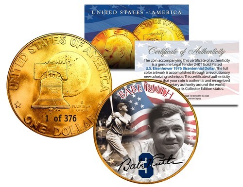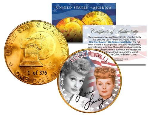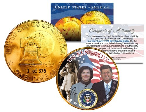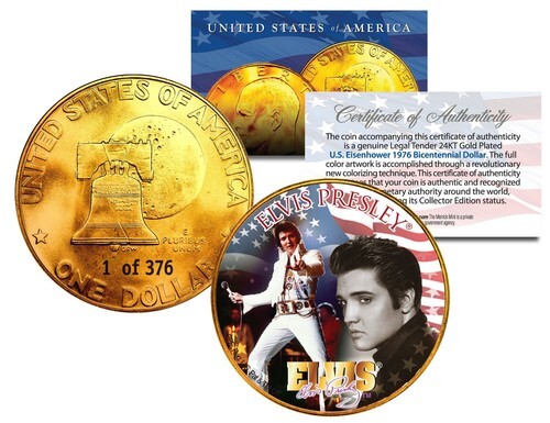Here is your chance to own one of the most Limited Edition Genuine Legal Tender coins ever made. Each coin is beautifully colorized on the front with an iconic image of one of the most famous icons in the world! Colorizing coins involves the unique application of special inks directly to the surface of a coin using a unique and painstakingly multicolor coin process that achieves a level of detail, color saturation, and durability that is #1 in the industry. The result is an everlasting colorized coin collectible of ultra-high quality. On the back of the coin features its own unique serial number which was laser printed on the coin itself?a coin world first! Each coin is limited and individually serial numbered of only 376 coins worldwide. Once the edition is sold out it will never be made again. Each coin used is a genuine and authentic 1976 Bicentennial Eisenhower Dollar. This 1976 Ike Dollar was only produced during one year by the US Mint in a very limited production, and was called the Bicentennial issue. The coin is super large and features the Liberty Bell superimposed against the Moon. On top of all these great features, the coin itself is entirely layered with 7mils of Genuine 24 Karat Gold. You get a full color Certificate of Authenticity with each coin and a coin capsule. OFFICIALLY LICENSED!