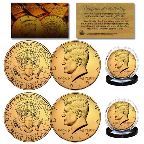 Buy one and get one FREE! Here is your chance to own the 24KT Gold Plated 2021 Philadelphia Mint JFK Kennedy Half Dollar U.S. coin. Each coin is 24KT Gold Plated by the Merrick Mint to highlight the original design using a unique authentic process. The result is an everlasting 24KT Gold Plated coin collectible of ultra-high quality that is #1 in the industry. Each coin features the left portrait of John F. Kennedy design on the obverse and a modified presidential seal design on the reverse. Each coin is genuine legal tender of the United States and comes in an acrylic coin holder and includes a Full Color 2-sided Certificate of Authenticity. The 2021 Kennedy half dollar is a U.S. fifty cent coin with P mint mark.